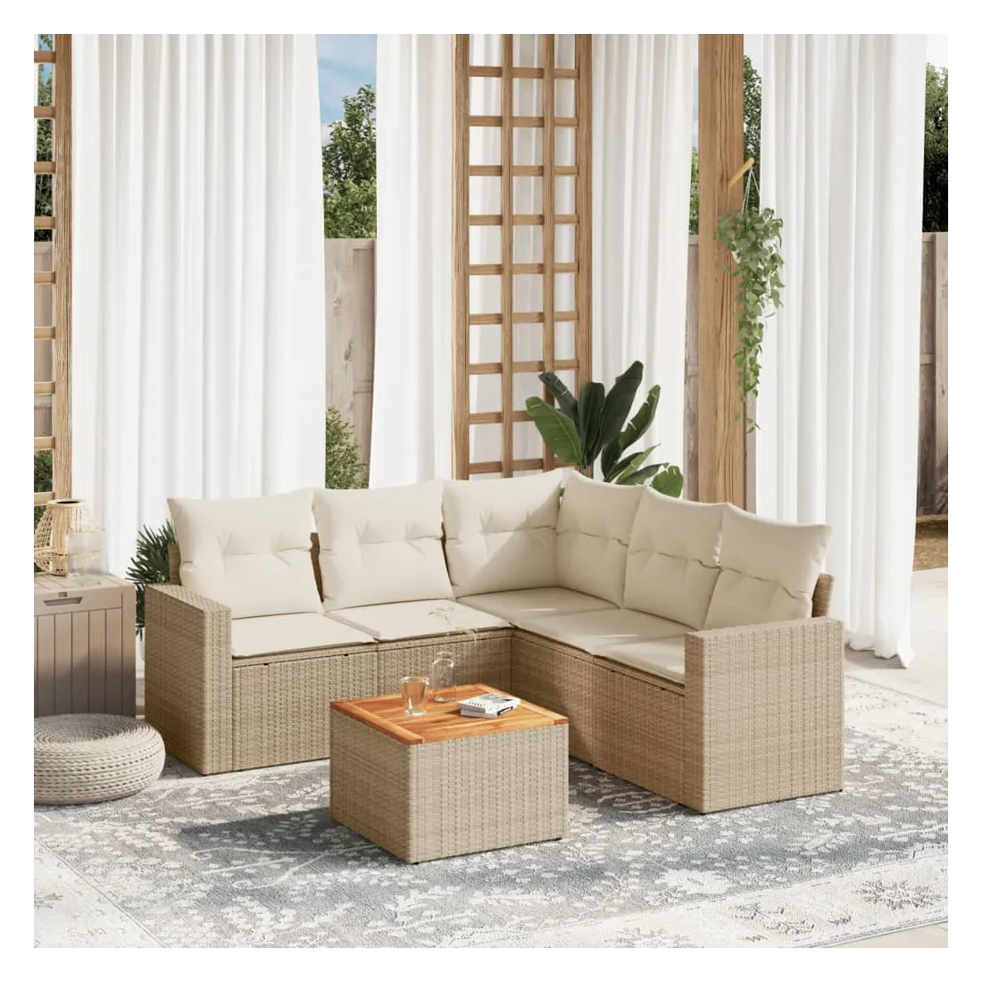 Cet ensemble de canapés de jardin est le complément parfait de votre arrière-cour, terrasse ou patio, offrant un espace confortable et accueillant pour discuter avec la famille et les amis ou simplement se détendre et profiter de l'extérieur. Matériau durable : la résine tressée, également connue sous le nom de poly rotin, est un matériau synthétique solide et nécessitant peu d'entretien qui ressemble au rotin naturel. Il est léger, facile à nettoyer et couramment utilisé pour les meubles d'extérieur en raison de sa durabilité et de ses propriétés de résistance aux intempéries.Fonction de rangement avec sac résistant à l'eau : chaque siège de jardin dispose d'un espace de rangement sous l'assise, complété par un sac résistant à l'eau pour ranger les coussins, les jouets et d'autres objets. Les sacs intérieurs sont dotés d'un couvercle et peuvent être solidement fixés aux sièges à l'aide de bandes auto-agrippantes pour plus de stabilité.Dessus stable et facile à nettoyer : cette table de jardin a un dessus en bois d'acacia robuste, durable et facile à nettoyer avec un chiffon humide.Housse amovible et lavable : ces coussins de siège sont dotés de housses amovibles pour un lavage et un entretien faciles.Conception modulaire : cet ensemble de meubles d'extérieur a une conception modulaire, ce qui le rend complètement flexible et facile à déplacer, afin que vous puissiez créer un agencement de meubles d'extérieur personnalisé. Bon à savoir :Pour que vos meubles d'extérieur restent beaux, nous vous recommandons de les protéger avec une housse imperméable.