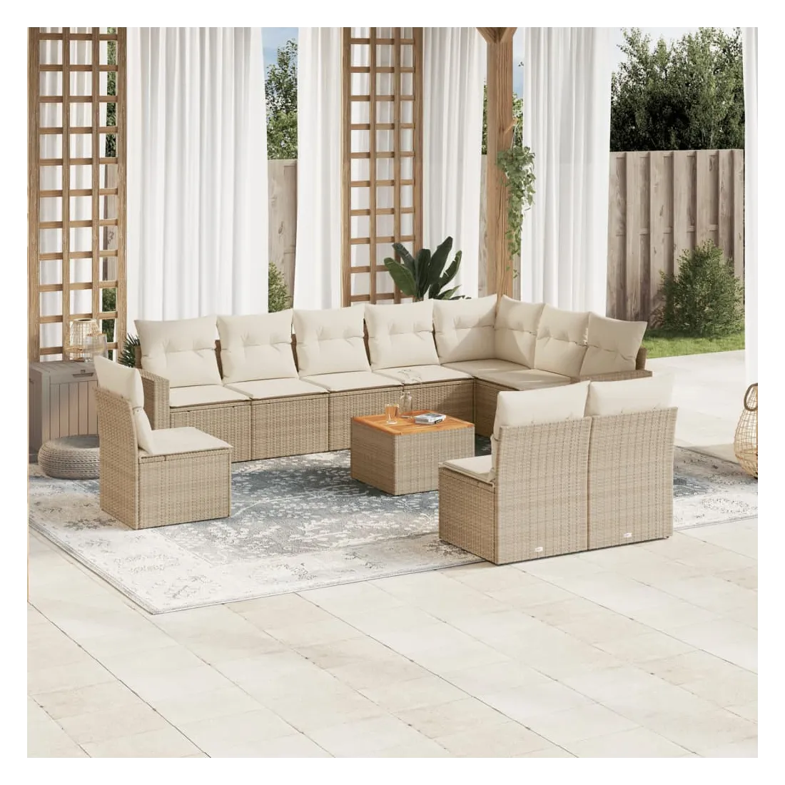 Cet ensemble de canapés de jardin est le complément parfait de votre arrière-cour, terrasse ou patio, offrant un espace confortable et accueillant pour discuter avec la famille et les amis ou simplement se détendre et profiter de l'extérieur. Matériau durable : la résine tressée, également connue sous le nom de poly rotin, est un matériau synthétique solide et nécessitant peu d'entretien qui ressemble au rotin naturel. Il est léger, facile à nettoyer et couramment utilisé pour les meubles d'extérieur en raison de sa durabilité et de ses propriétés de résistance aux intempéries.Fonction de rangement avec sac résistant à l'eau : chaque siège de jardin dispose d'un espace de rangement sous l'assise, complété par un sac résistant à l'eau pour ranger les coussins, les jouets et d'autres objets. Les sacs intérieurs sont dotés d'un couvercle et peuvent être solidement fixés aux sièges à l'aide de bandes auto-agrippantes pour plus de stabilité.Dessus stable et facile à nettoyer : cette table de jardin a un dessus en bois d'acacia robuste, durable et facile à nettoyer avec un chiffon humide.Housse amovible et lavable : ces coussins de siège sont dotés de housses amovibles pour un lavage et un entretien faciles.Conception modulaire : cet ensemble de meubles d'extérieur a une conception modulaire, ce qui le rend complètement flexible et facile à déplacer, afin que vous puissiez créer un agencement de meubles d'extérieur personnalisé. Bon à savoir :Pour que vos meubles d'extérieur restent beaux, nous vous recommandons de les protéger avec une housse imperméable.