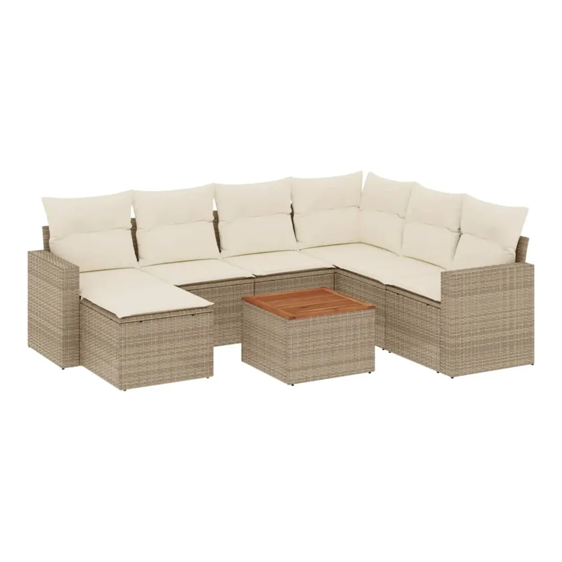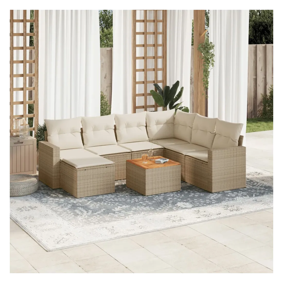 Cet ensemble de canapés de jardin est le complément parfait de votre arrière-cour, terrasse ou patio, offrant un espace confortable et accueillant pour discuter avec la famille et les amis ou simplement se détendre et profiter de l'extérieur. Matériau durable : la résine tressée, également connue sous le nom de poly rotin, est un matériau synthétique solide et nécessitant peu d'entretien qui ressemble au rotin naturel. Il est léger, facile à nettoyer et couramment utilisé pour les meubles d'extérieur en raison de sa durabilité et de ses propriétés de résistance aux intempéries.Fonction de rangement avec sac résistant à l'eau : chaque siège de jardin dispose d'un espace de rangement sous l'assise, complété par un sac résistant à l'eau pour ranger les coussins, les jouets et d'autres objets. Les sacs intérieurs sont dotés d'un couvercle et peuvent être solidement fixés aux sièges à l'aide de bandes auto-agrippantes pour plus de stabilité.Dessus stable et facile à nettoyer : cette table de jardin a un dessus en bois d'acacia robuste, durable et facile à nettoyer avec un chiffon humide.Pouf polyvalent : le tabouret est polyvalent, servant de repose-pieds confortable lorsque vous vous prélassez sur le canapé ou de siège supplémentaire dans votre jardin.Conception modulaire : cet ensemble de meubles d'extérieur a une conception modulaire, ce qui le rend complètement flexible et facile à déplacer, afin que vous puissiez créer un agencement de meubles d'extérieur personnalisé. Bon à savoir :Pour que vos meubles d'extérieur restent beaux, nous vous recommandons de les protéger avec une housse imperméable.