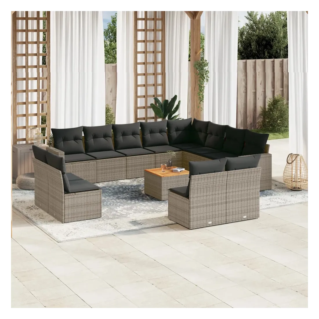 Cet ensemble de canapés de jardin est le complément parfait de votre arrière-cour, terrasse ou patio, offrant un espace confortable et accueillant pour discuter avec la famille et les amis ou simplement se détendre et profiter de l'extérieur. Matériau durable : la résine tressée, également connue sous le nom de poly rotin, est un matériau synthétique solide et nécessitant peu d'entretien qui ressemble au rotin naturel. Il est léger, facile à nettoyer et couramment utilisé pour les meubles d'extérieur en raison de sa durabilité et de ses propriétés de résistance aux intempéries.Fonction de rangement avec sac résistant à l'eau : chaque siège de jardin dispose d'un espace de rangement sous l'assise, complété par un sac résistant à l'eau pour ranger les coussins, les jouets et d'autres objets. Les sacs intérieurs sont dotés d'un couvercle et peuvent être solidement fixés aux sièges à l'aide de bandes auto-agrippantes pour plus de stabilité.Dessus stable et facile à nettoyer : cette table de jardin a un dessus en bois d'acacia robuste, durable et facile à nettoyer avec un chiffon humide.Housse amovible et lavable : ces coussins de siège sont dotés de housses amovibles pour un lavage et un entretien faciles.Conception modulaire : cet ensemble de meubles d'extérieur a une conception modulaire, ce qui le rend complètement flexible et facile à déplacer, afin que vous puissiez créer un agencement de meubles d'extérieur personnalisé. Bon à savoir :Pour que vos meubles d'extérieur restent beaux, nous vous recommandons de les protéger avec une housse imperméable.