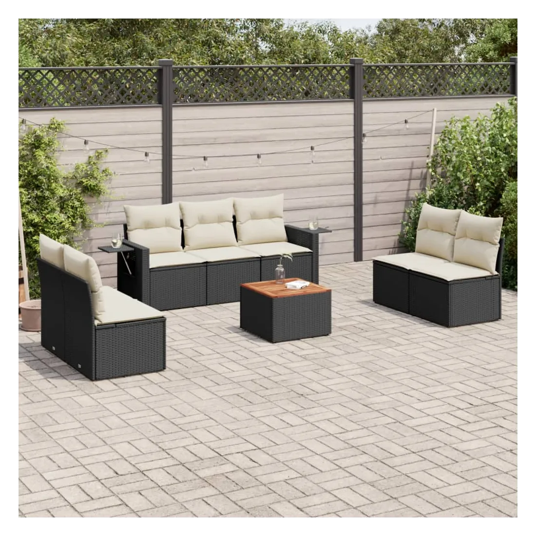 Cet ensemble de canapés de jardin est le complément parfait de votre arrière-cour, terrasse ou patio, offrant un espace confortable et accueillant pour discuter avec la famille et les amis ou simplement se détendre et profiter de l'extérieur. Matériau durable : la résine tressée, également connue sous le nom de poly rotin, est un matériau synthétique solide et nécessitant peu d'entretien qui ressemble au rotin naturel. Il est léger, facile à nettoyer et couramment utilisé pour les meubles d'extérieur en raison de sa durabilité et de ses propriétés de résistance aux intempéries.Fonction de rangement avec sac résistant à l'eau : chaque siège de jardin dispose d'un espace de rangement sous l'assise, complété par un sac résistant à l'eau pour ranger les coussins, les jouets et d'autres objets. Les sacs intérieurs sont dotés d'un couvercle et peuvent être solidement fixés aux sièges à l'aide de bandes auto-agrippantes pour plus de stabilité.Dessus stable et facile à nettoyer : cette table de jardin a un dessus en bois d'acacia robuste, durable et facile à nettoyer avec un chiffon humide.Table d'appoint pratique : ce mobilier d'extérieur comprend des tables d'appoint pliables avec un ressort à gaz sur les accoudoirs, offrant des endroits pratiques pour garder vos essentiels à portée de main.Conception modulaire : cet ensemble de meubles d'extérieur a une conception modulaire, ce qui le rend complètement flexible et facile à déplacer, afin que vous puissiez créer un agencement de meubles d'extérieur personnalisé. Bon à savoir :Pour que vos meubles d'extérieur restent beaux, nous vous recommandons de les protéger avec une housse imperméable.