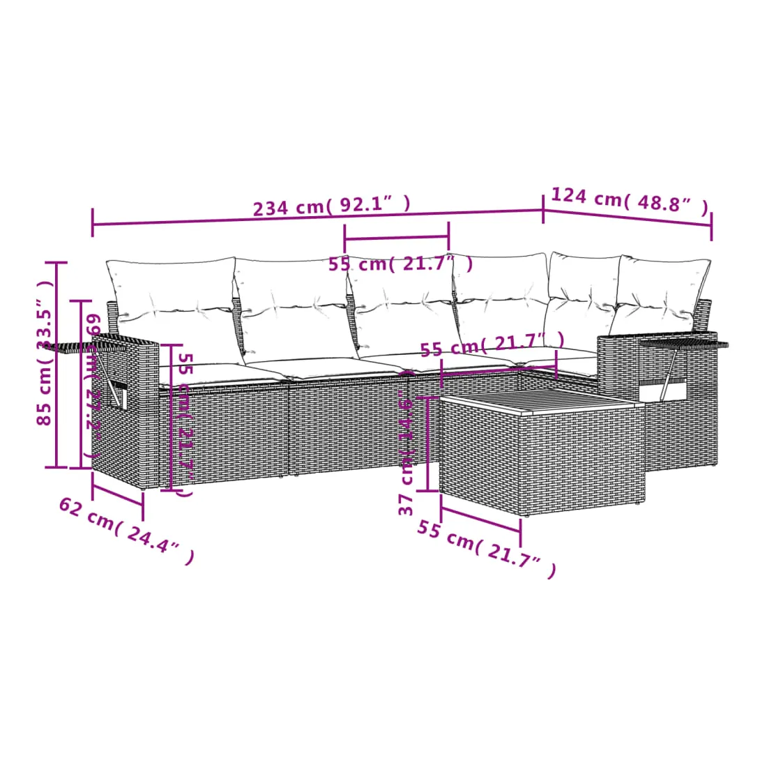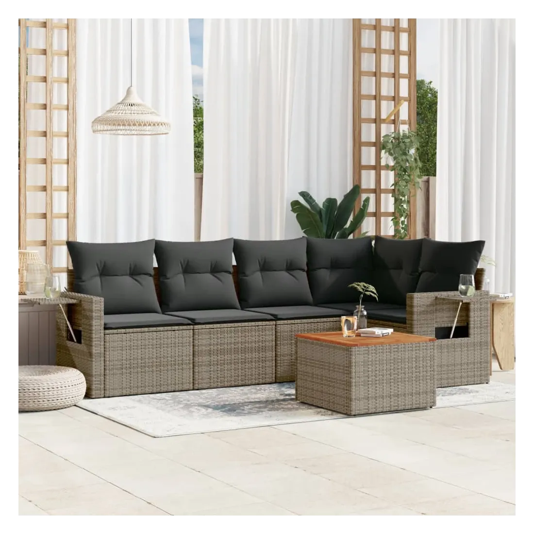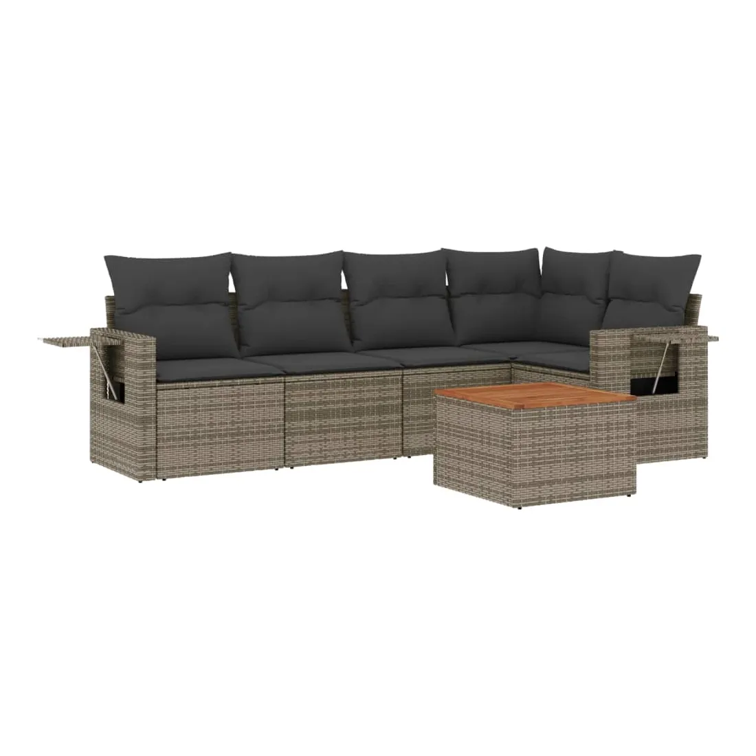 Cet ensemble de canapés de jardin est le complément parfait de votre arrière-cour, terrasse ou patio, offrant un espace confortable et accueillant pour discuter avec la famille et les amis ou simplement se détendre et profiter de l'extérieur. Matériau durable : la résine tressée, également connue sous le nom de poly rotin, est un matériau synthétique solide et nécessitant peu d'entretien qui ressemble au rotin naturel. Il est léger, facile à nettoyer et couramment utilisé pour les meubles d'extérieur en raison de sa durabilité et de ses propriétés de résistance aux intempéries.Fonction de rangement avec sac résistant à l'eau : chaque siège de jardin dispose d'un espace de rangement sous l'assise, complété par un sac résistant à l'eau pour ranger les coussins, les jouets et d'autres objets. Les sacs intérieurs sont dotés d'un couvercle et peuvent être solidement fixés aux sièges à l'aide de bandes auto-agrippantes pour plus de stabilité.Dessus stable et facile à nettoyer : cette table de jardin a un dessus en bois d'acacia robuste, durable et facile à nettoyer avec un chiffon humide.Table d'appoint pratique : ce mobilier d'extérieur comprend des tables d'appoint pliables avec un ressort à gaz sur les accoudoirs, offrant des endroits pratiques pour garder vos essentiels à portée de main.Conception modulaire : cet ensemble de meubles d'extérieur a une conception modulaire, ce qui le rend complètement flexible et facile à déplacer, afin que vous puissiez créer un agencement de meubles d'extérieur personnalisé. Bon à savoir :Pour que vos meubles d'extérieur restent beaux, nous vous recommandons de les protéger avec une housse imperméable.