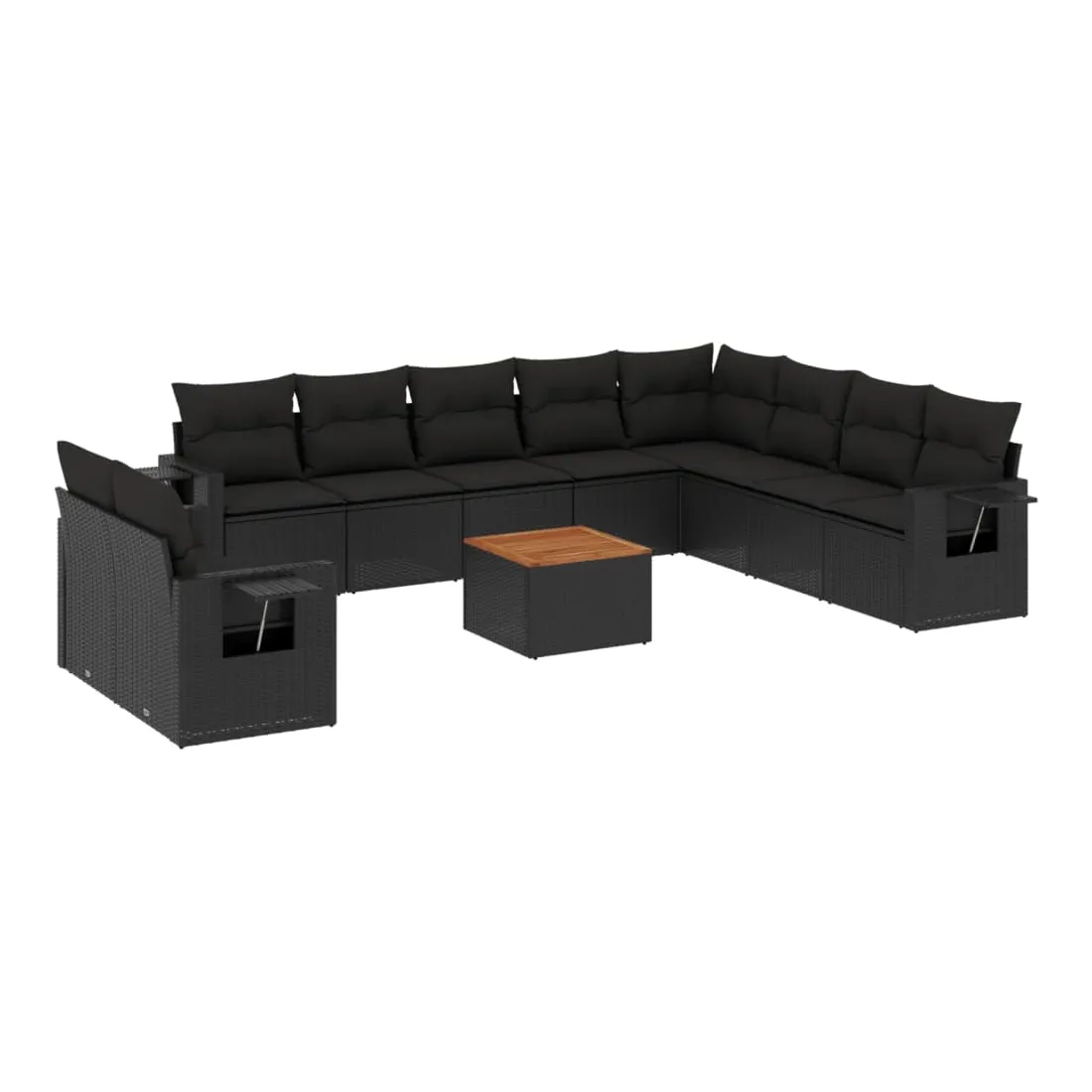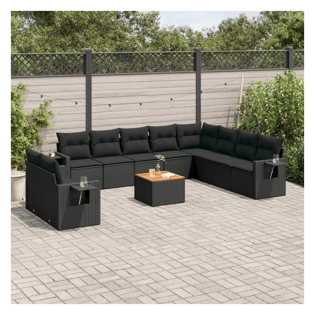 Cet ensemble de canapés de jardin est le complément parfait de votre arrière-cour, terrasse ou patio, offrant un espace confortable et accueillant pour discuter avec la famille et les amis ou simplement se détendre et profiter de l'extérieur. Matériau durable : la résine tressée, également connue sous le nom de poly rotin, est un matériau synthétique solide et nécessitant peu d'entretien qui ressemble au rotin naturel. Il est léger, facile à nettoyer et couramment utilisé pour les meubles d'extérieur en raison de sa durabilité et de ses propriétés de résistance aux intempéries.Fonction de rangement avec sac résistant à l'eau : chaque siège de jardin dispose d'un espace de rangement sous l'assise, complété par un sac résistant à l'eau pour ranger les coussins, les jouets et d'autres objets. Les sacs intérieurs sont dotés d'un couvercle et peuvent être solidement fixés aux sièges à l'aide de bandes auto-agrippantes pour plus de stabilité.Dessus stable et facile à nettoyer : cette table de jardin a un dessus en bois d'acacia robuste, durable et facile à nettoyer avec un chiffon humide.Table d'appoint pratique : ce mobilier d'extérieur comprend des tables d'appoint pliables avec un ressort à gaz sur les accoudoirs, offrant des endroits pratiques pour garder vos essentiels à portée de main.Conception modulaire : cet ensemble de meubles d'extérieur a une conception modulaire, ce qui le rend complètement flexible et facile à déplacer, afin que vous puissiez créer un agencement de meubles d'extérieur personnalisé. Bon à savoir :Pour que vos meubles d'extérieur restent beaux, nous vous recommandons de les protéger avec une housse imperméable.