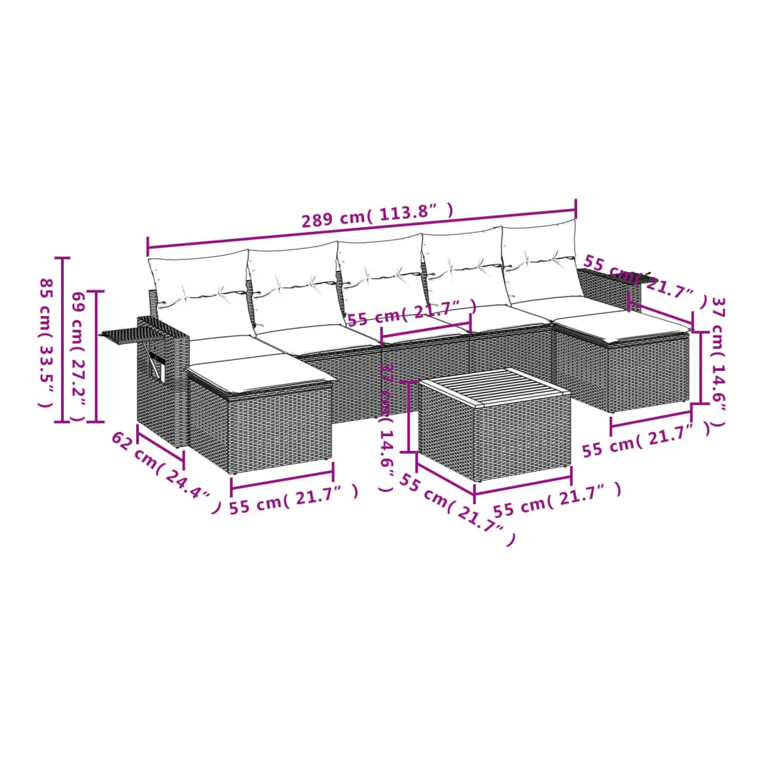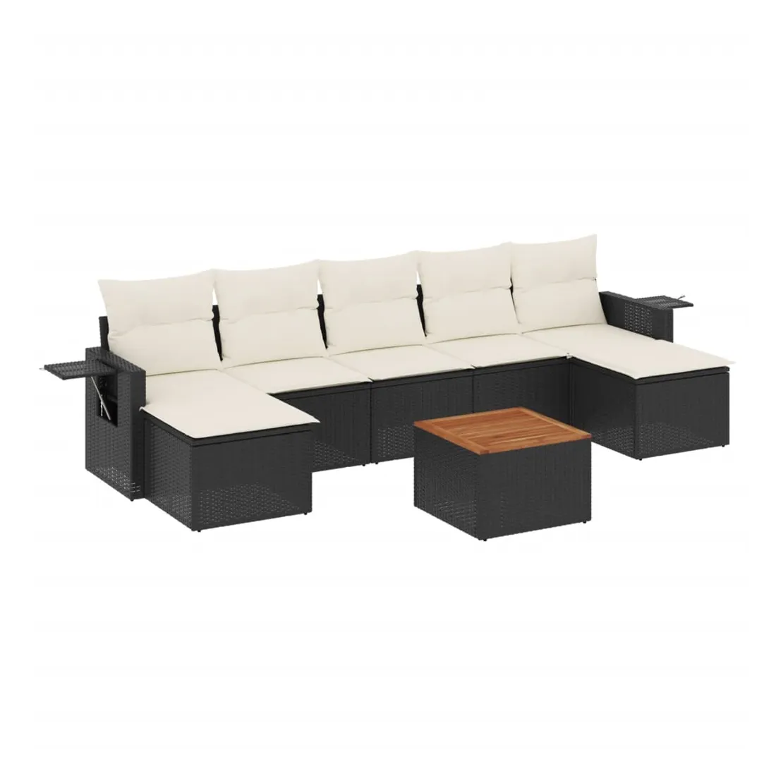 Cet ensemble de canapés de jardin est le complément parfait de votre arrière-cour, terrasse ou patio, offrant un espace confortable et accueillant pour discuter avec la famille et les amis ou simplement se détendre et profiter de l'extérieur. Matériau durable : la résine tressée, également connue sous le nom de poly rotin, est un matériau synthétique solide et nécessitant peu d'entretien qui ressemble au rotin naturel. Il est léger, facile à nettoyer et couramment utilisé pour les meubles d'extérieur en raison de sa durabilité et de ses propriétés de résistance aux intempéries.Fonction de rangement avec sac résistant à l'eau : chaque siège de jardin dispose d'un espace de rangement sous l'assise, complété par un sac résistant à l'eau pour ranger les coussins, les jouets et d'autres objets. Les sacs intérieurs sont dotés d'un couvercle et peuvent être solidement fixés aux sièges à l'aide de bandes auto-agrippantes pour plus de stabilité.Dessus stable et facile à nettoyer : cette table de jardin a un dessus en bois d'acacia robuste, durable et facile à nettoyer avec un chiffon humide.Table d'appoint pratique : ce mobilier d'extérieur comprend des tables d'appoint pliables avec un ressort à gaz sur les accoudoirs, offrant des endroits pratiques pour garder vos essentiels à portée de main.Conception modulaire : cet ensemble de meubles d'extérieur a une conception modulaire, ce qui le rend complètement flexible et facile à déplacer, afin que vous puissiez créer un agencement de meubles d'extérieur personnalisé. Bon à savoir :Pour que vos meubles d'extérieur restent beaux, nous vous recommandons de les protéger avec une housse imperméable.