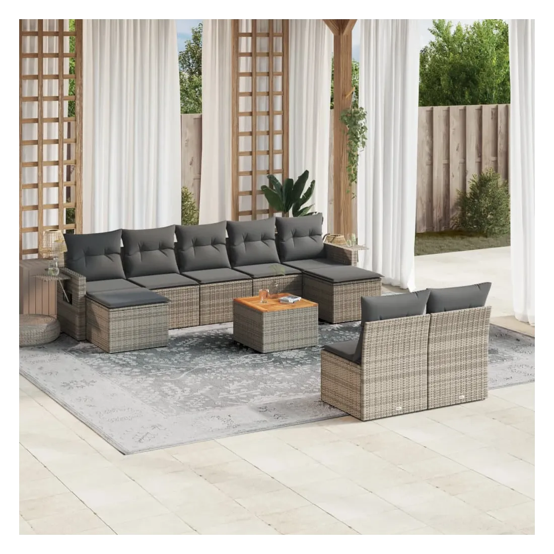 Cet ensemble de canapés de jardin est le complément parfait de votre arrière-cour, terrasse ou patio, offrant un espace confortable et accueillant pour discuter avec la famille et les amis ou simplement se détendre et profiter de l'extérieur. Matériau durable : la résine tressée, également connue sous le nom de poly rotin, est un matériau synthétique solide et nécessitant peu d'entretien qui ressemble au rotin naturel. Il est léger, facile à nettoyer et couramment utilisé pour les meubles d'extérieur en raison de sa durabilité et de ses propriétés de résistance aux intempéries.Fonction de rangement avec sac résistant à l'eau : chaque siège de jardin dispose d'un espace de rangement sous l'assise, complété par un sac résistant à l'eau pour ranger les coussins, les jouets et d'autres objets. Les sacs intérieurs sont dotés d'un couvercle et peuvent être solidement fixés aux sièges à l'aide de bandes auto-agrippantes pour plus de stabilité.Dessus stable et facile à nettoyer : cette table de jardin a un dessus en bois d'acacia robuste, durable et facile à nettoyer avec un chiffon humide.Table d'appoint pratique : ce mobilier d'extérieur comprend des tables d'appoint pliables avec un ressort à gaz sur les accoudoirs, offrant des endroits pratiques pour garder vos essentiels à portée de main.Conception modulaire : cet ensemble de meubles d'extérieur a une conception modulaire, ce qui le rend complètement flexible et facile à déplacer, afin que vous puissiez créer un agencement de meubles d'extérieur personnalisé. Bon à savoir :Pour que vos meubles d'extérieur restent beaux, nous vous recommandons de les protéger avec une housse imperméable.