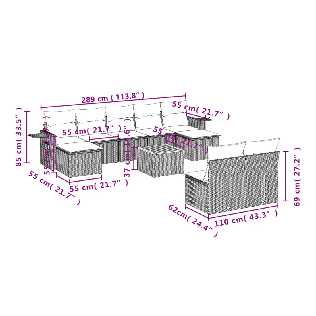 - 9 x coussin d'assise avec housse amovible et lavable