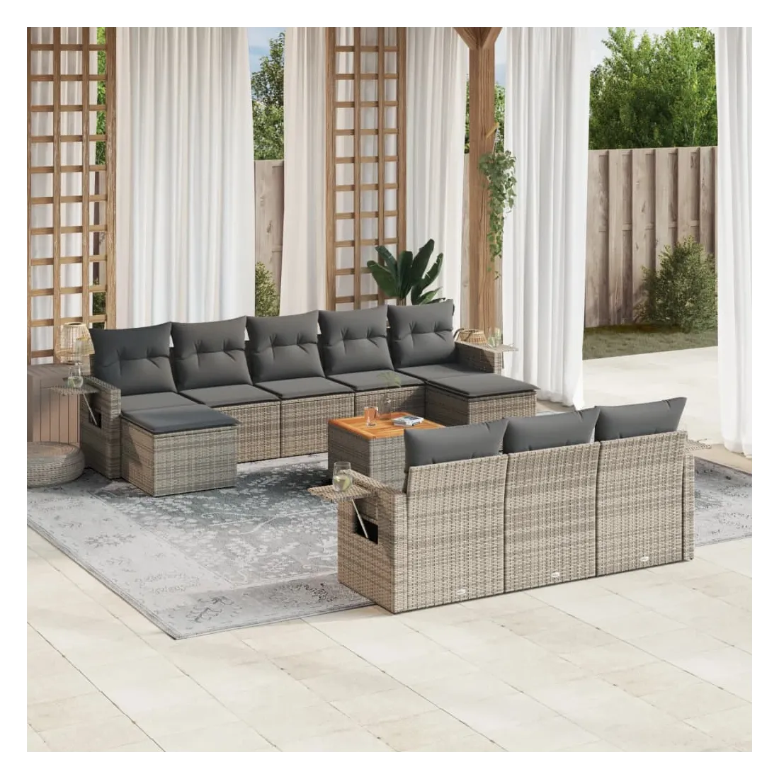 Cet ensemble de canapés de jardin est le complément parfait de votre arrière-cour, terrasse ou patio, offrant un espace confortable et accueillant pour discuter avec la famille et les amis ou simplement se détendre et profiter de l'extérieur. Matériau durable : la résine tressée, également connue sous le nom de poly rotin, est un matériau synthétique solide et nécessitant peu d'entretien qui ressemble au rotin naturel. Il est léger, facile à nettoyer et couramment utilisé pour les meubles d'extérieur en raison de sa durabilité et de ses propriétés de résistance aux intempéries.Fonction de rangement avec sac résistant à l'eau : chaque siège de jardin dispose d'un espace de rangement sous l'assise, complété par un sac résistant à l'eau pour ranger les coussins, les jouets et d'autres objets. Les sacs intérieurs sont dotés d'un couvercle et peuvent être solidement fixés aux sièges à l'aide de bandes auto-agrippantes pour plus de stabilité.Dessus stable et facile à nettoyer : cette table de jardin a un dessus en bois d'acacia robuste, durable et facile à nettoyer avec un chiffon humide.Table d'appoint pratique : ce mobilier d'extérieur comprend des tables d'appoint pliables avec un ressort à gaz sur les accoudoirs, offrant des endroits pratiques pour garder vos essentiels à portée de main.Conception modulaire : cet ensemble de meubles d'extérieur a une conception modulaire, ce qui le rend complètement flexible et facile à déplacer, afin que vous puissiez créer un agencement de meubles d'extérieur personnalisé. Bon à savoir :Pour que vos meubles d'extérieur restent beaux, nous vous recommandons de les protéger avec une housse imperméable.