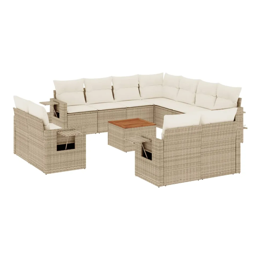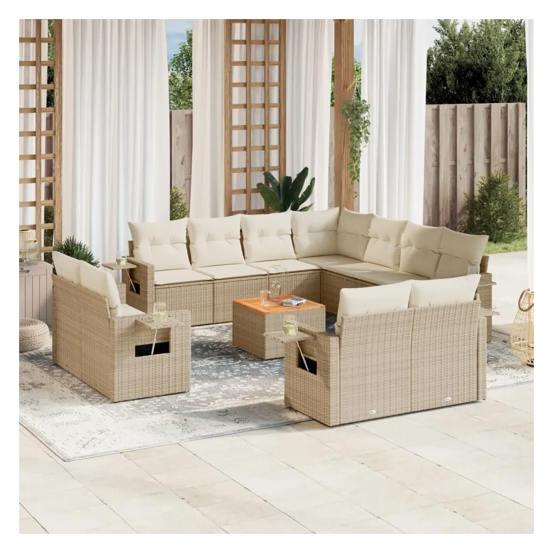Cet ensemble de canapés de jardin est le complément parfait de votre arrière-cour, terrasse ou patio, offrant un espace confortable et accueillant pour discuter avec la famille et les amis ou simplement se détendre et profiter de l'extérieur. Matériau durable : la résine tressée, également connue sous le nom de poly rotin, est un matériau synthétique solide et nécessitant peu d'entretien qui ressemble au rotin naturel. Il est léger, facile à nettoyer et couramment utilisé pour les meubles d'extérieur en raison de sa durabilité et de ses propriétés de résistance aux intempéries.Fonction de rangement avec sac résistant à l'eau : chaque siège de jardin dispose d'un espace de rangement sous l'assise, complété par un sac résistant à l'eau pour ranger les coussins, les jouets et d'autres objets. Les sacs intérieurs sont dotés d'un couvercle et peuvent être solidement fixés aux sièges à l'aide de bandes auto-agrippantes pour plus de stabilité.Dessus stable et facile à nettoyer : cette table de jardin a un dessus en bois d'acacia robuste, durable et facile à nettoyer avec un chiffon humide.Table d'appoint pratique : ce mobilier d'extérieur comprend des tables d'appoint pliables avec un ressort à gaz sur les accoudoirs, offrant des endroits pratiques pour garder vos essentiels à portée de main.Conception modulaire : cet ensemble de meubles d'extérieur a une conception modulaire, ce qui le rend complètement flexible et facile à déplacer, afin que vous puissiez créer un agencement de meubles d'extérieur personnalisé. Bon à savoir :Pour que vos meubles d'extérieur restent beaux, nous vous recommandons de les protéger avec une housse imperméable.