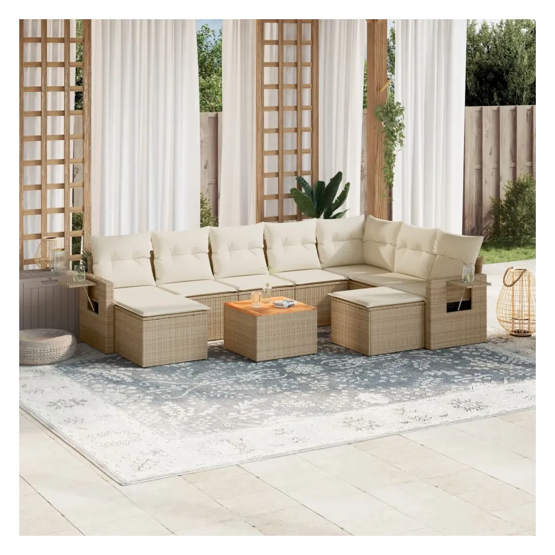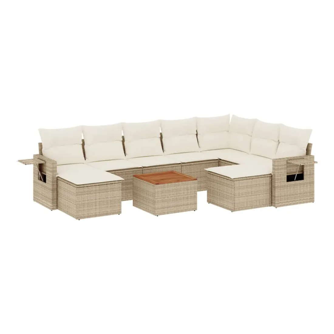 Cet ensemble de canapés de jardin est le complément parfait de votre arrière-cour, terrasse ou patio, offrant un espace confortable et accueillant pour discuter avec la famille et les amis ou simplement se détendre et profiter de l'extérieur. Matériau durable : la résine tressée, également connue sous le nom de poly rotin, est un matériau synthétique solide et nécessitant peu d'entretien qui ressemble au rotin naturel. Il est léger, facile à nettoyer et couramment utilisé pour les meubles d'extérieur en raison de sa durabilité et de ses propriétés de résistance aux intempéries.Fonction de rangement avec sac résistant à l'eau : chaque siège de jardin dispose d'un espace de rangement sous l'assise, complété par un sac résistant à l'eau pour ranger les coussins, les jouets et d'autres objets. Les sacs intérieurs sont dotés d'un couvercle et peuvent être solidement fixés aux sièges à l'aide de bandes auto-agrippantes pour plus de stabilité.Dessus stable et facile à nettoyer : cette table de jardin a un dessus en bois d'acacia robuste, durable et facile à nettoyer avec un chiffon humide.Table d'appoint pratique : ce mobilier d'extérieur comprend des tables d'appoint pliables avec un ressort à gaz sur les accoudoirs, offrant des endroits pratiques pour garder vos essentiels à portée de main.Conception modulaire : cet ensemble de meubles d'extérieur a une conception modulaire, ce qui le rend complètement flexible et facile à déplacer, afin que vous puissiez créer un agencement de meubles d'extérieur personnalisé. Bon à savoir :Pour que vos meubles d'extérieur restent beaux, nous vous recommandons de les protéger avec une housse imperméable.