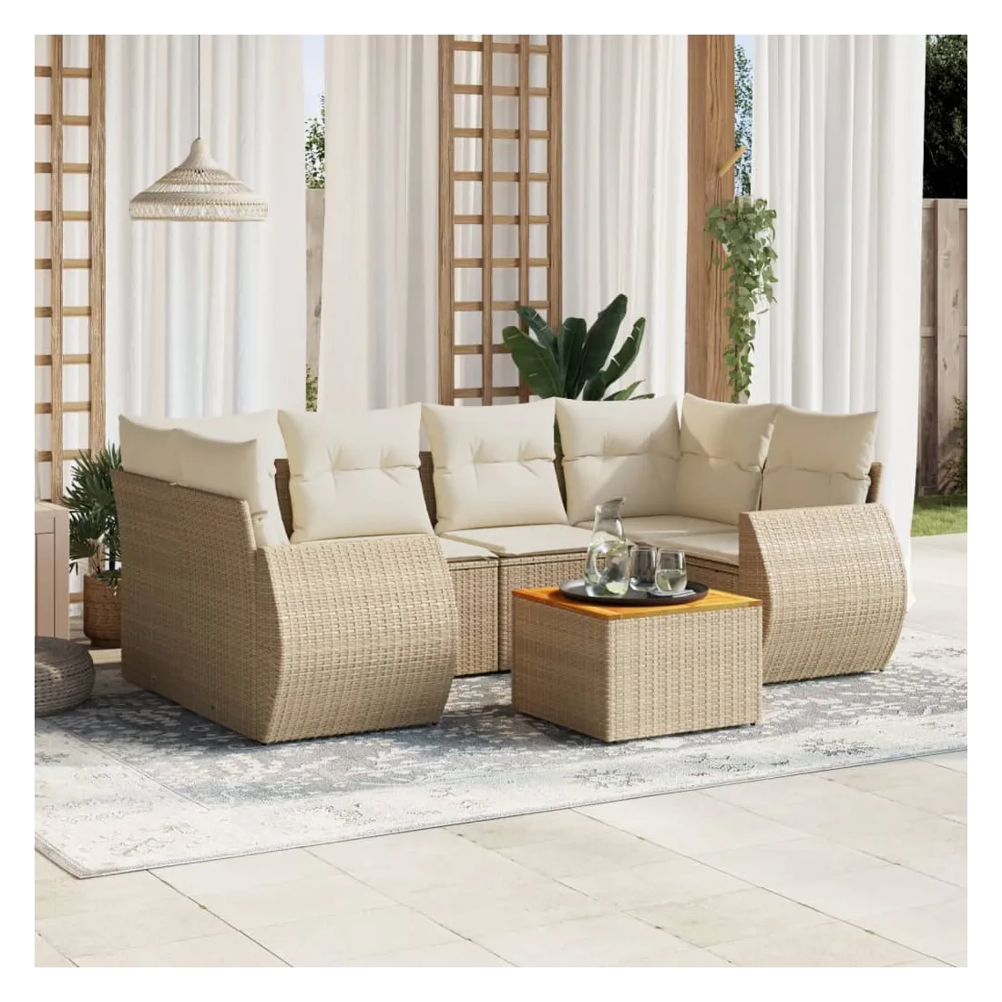 Cet ensemble de canapés de jardin est le complément parfait de votre arrière-cour, terrasse ou patio, offrant un espace confortable et accueillant pour discuter avec la famille et les amis ou simplement se détendre et profiter de l'extérieur. Matériau durable : la résine tressée, également connue sous le nom de poly rotin, est un matériau synthétique solide et nécessitant peu d'entretien qui ressemble au rotin naturel. Il est léger, facile à nettoyer et couramment utilisé pour les meubles d'extérieur en raison de sa durabilité et de ses propriétés de résistance aux intempéries.Dessus stable et facile à nettoyer : cette table de jardin a un dessus en bois d'acacia robuste, durable et facile à nettoyer avec un chiffon humide. Fonction de rangement avec sac résistant à l'eau : chaque siège de jardin dispose d'un espace de rangement sous l'assise, complété par un sac résistant à l'eau pour ranger les coussins, les jouets et d'autres objets. Les sacs intérieurs sont dotés d'un couvercle et peuvent être solidement fixés aux sièges à l'aide de bandes auto-agrippantes pour plus de stabilité.Expérience d'assise confortable : ce mobilier d'extérieur, doté de coussins épais, offre une expérience d'assise confortable.Conception modulaire : cet ensemble de meubles d'extérieur a une conception modulaire, ce qui le rend complètement flexible et facile à déplacer, afin que vous puissiez créer un agencement de meubles d'extérieur personnalisé. Bon à savoir :Pour que vos meubles d'extérieur restent beaux, nous vous recommandons de les protéger avec une housse imperméable.