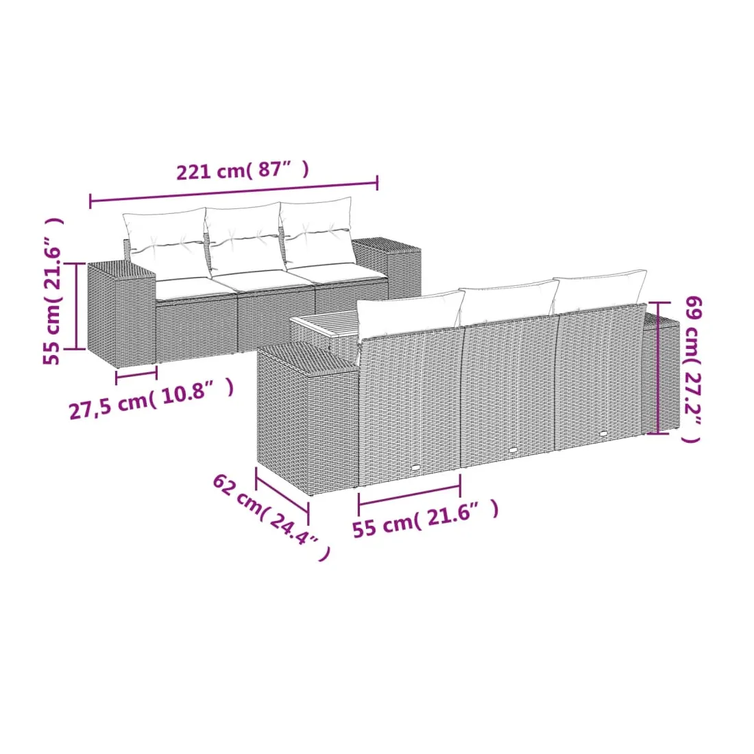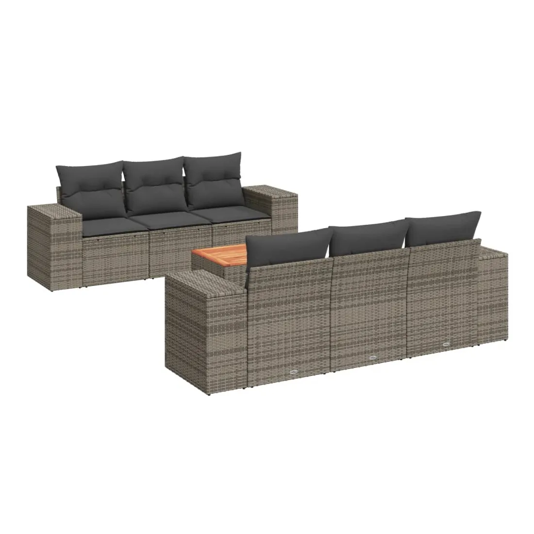 Cet ensemble de canapés de jardin est le complément parfait de votre arrière-cour, terrasse ou patio, offrant un espace confortable et accueillant pour discuter avec la famille et les amis ou simplement se détendre et profiter de l'extérieur. Matériau durable : la résine tressée, également connue sous le nom de poly rotin, est un matériau synthétique solide et nécessitant peu d'entretien qui ressemble au rotin naturel. Il est léger, facile à nettoyer et couramment utilisé pour les meubles d'extérieur en raison de sa durabilité et de ses propriétés de résistance aux intempéries. Fonction de rangement avec sac résistant à l'eau : chaque siège de jardin dispose d'un espace de rangement sous l'assise, complété par un sac résistant à l'eau pour ranger les coussins, les jouets et d'autres objets. Les sacs intérieurs sont dotés d'un couvercle et peuvent être solidement fixés aux sièges à l'aide de bandes auto-agrippantes pour plus de stabilité. Dessus stable et facile à nettoyer : cette table de jardin a un dessus en bois d'acacia robuste, durable et facile à nettoyer avec un chiffon humide. Expérience d'assise confortable : ce mobilier d'extérieur, doté de coussins épais, offre une expérience d'assise confortable. Conception modulaire : cet ensemble de meubles d'extérieur a une conception modulaire, ce qui le rend complètement flexible et facile à déplacer, afin que vous puissiez créer un agencement de meubles d'extérieur personnalisé. Bon à savoir :Pour que vos meubles d'extérieur restent beaux, nous vous recommandons de les protéger avec une housse imperméable.