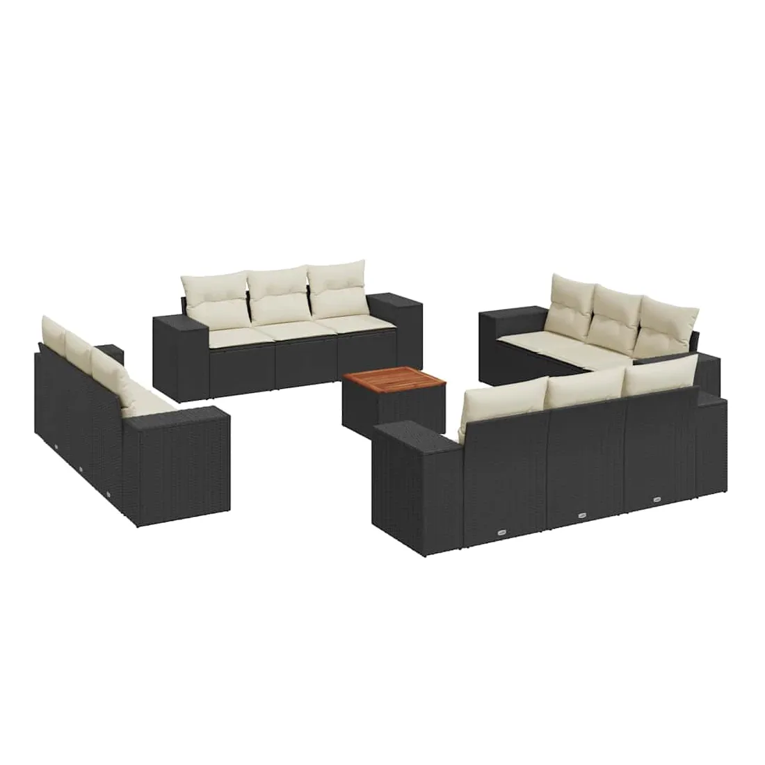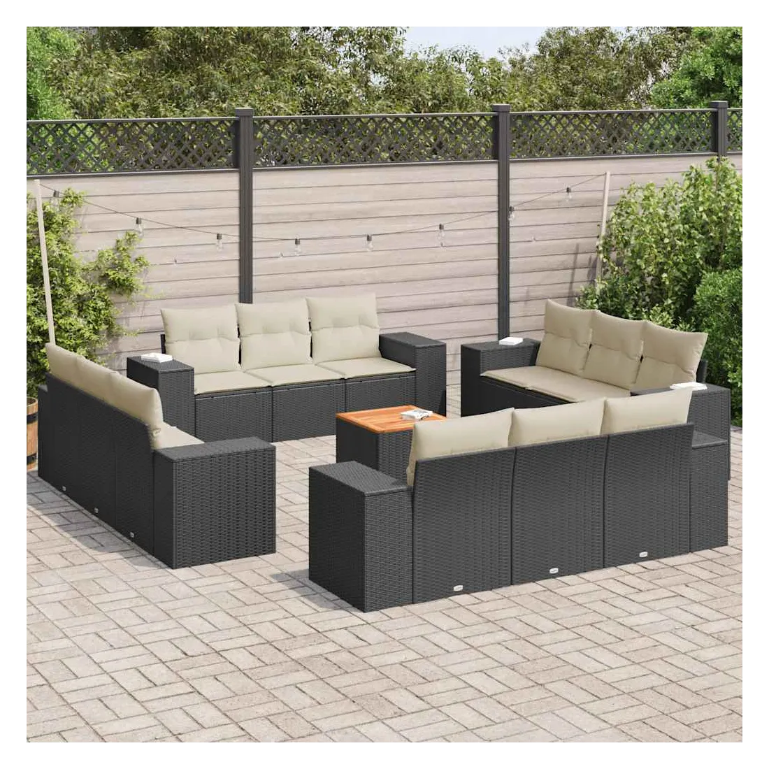 Cet ensemble de canapés de jardin est le complément parfait de votre arrière-cour, terrasse ou patio, offrant un espace confortable et accueillant pour discuter avec la famille et les amis ou simplement se détendre et profiter de l'extérieur. Matériau durable : la résine tressée, également connue sous le nom de poly rotin, est un matériau synthétique solide et nécessitant peu d'entretien qui ressemble au rotin naturel. Il est léger, facile à nettoyer et couramment utilisé pour les meubles d'extérieur en raison de sa durabilité et de ses propriétés de résistance aux intempéries. Fonction de rangement avec sac résistant à l'eau : chaque siège de jardin dispose d'un espace de rangement sous l'assise, complété par un sac résistant à l'eau pour ranger les coussins, les jouets et d'autres objets. Les sacs intérieurs sont dotés d'un couvercle et peuvent être solidement fixés aux sièges à l'aide de bandes auto-agrippantes pour plus de stabilité. Dessus stable et facile à nettoyer : cette table de jardin a un dessus en bois d'acacia robuste, durable et facile à nettoyer avec un chiffon humide. Expérience d'assise confortable : ce mobilier d'extérieur, doté de coussins épais, offre une expérience d'assise confortable. Conception modulaire : cet ensemble de meubles d'extérieur a une conception modulaire, ce qui le rend complètement flexible et facile à déplacer, afin que vous puissiez créer un agencement de meubles d'extérieur personnalisé. Bon à savoir :Pour que vos meubles d'extérieur restent beaux, nous vous recommandons de les protéger avec une housse imperméable.