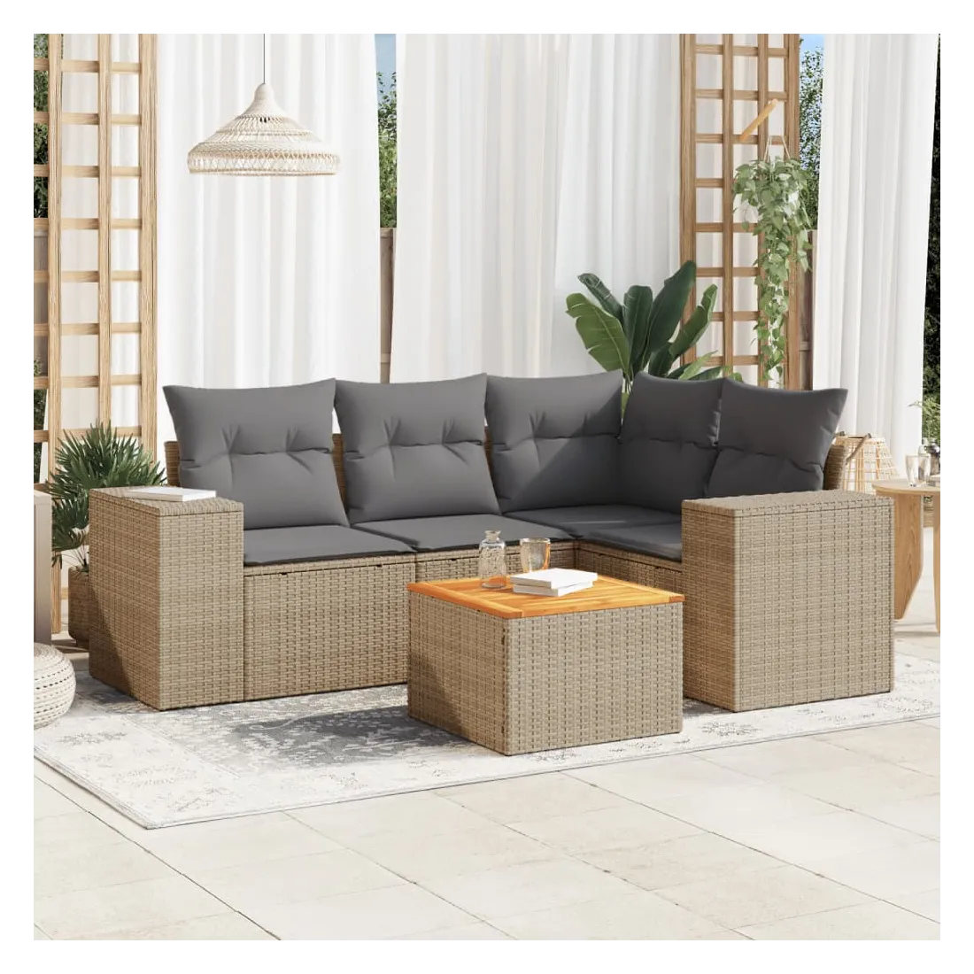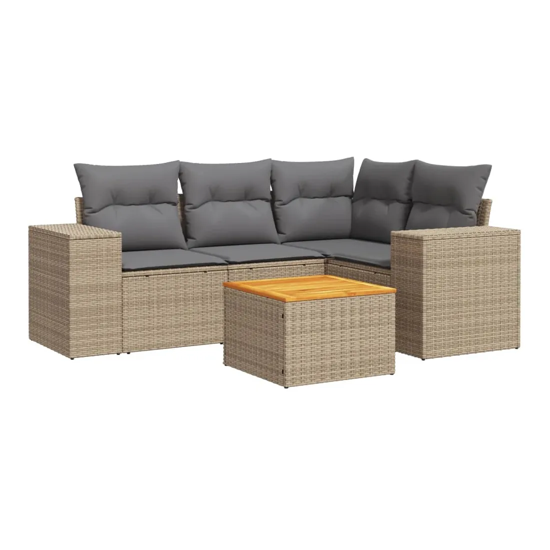 Cet ensemble de canapés de jardin est le complément parfait de votre arrière-cour, terrasse ou patio, offrant un espace confortable et accueillant pour discuter avec la famille et les amis ou simplement se détendre et profiter de l'extérieur. Matériau durable : la résine tressée, également connue sous le nom de poly rotin, est un matériau synthétique solide et nécessitant peu d'entretien qui ressemble au rotin naturel. Il est léger, facile à nettoyer et couramment utilisé pour les meubles d'extérieur en raison de sa durabilité et de ses propriétés de résistance aux intempéries.Dessus stable et facile à nettoyer : cette table de jardin a un dessus en bois d'acacia robuste, durable et facile à nettoyer avec un chiffon humide. Fonction de rangement avec sac résistant à l'eau : chaque siège de jardin dispose d'un espace de rangement sous l'assise, complété par un sac résistant à l'eau pour ranger les coussins, les jouets et d'autres objets. Les sacs intérieurs sont dotés d'un couvercle et peuvent être solidement fixés aux sièges à l'aide de bandes auto-agrippantes pour plus de stabilité.Expérience d'assise confortable : ce mobilier d'extérieur, doté de coussins épais, offre une expérience d'assise confortable.Conception modulaire : cet ensemble de meubles d'extérieur a une conception modulaire, ce qui le rend complètement flexible et facile à déplacer, afin que vous puissiez créer un agencement de meubles d'extérieur personnalisé. Bon à savoir :Pour que vos meubles d'extérieur restent beaux, nous vous recommandons de les protéger avec une housse imperméable.