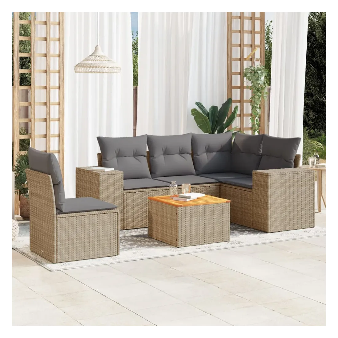 Cet ensemble de canapés de jardin est le complément parfait de votre arrière-cour, terrasse ou patio, offrant un espace confortable et accueillant pour discuter avec la famille et les amis ou simplement se détendre et profiter de l'extérieur. Matériau durable : la résine tressée, également connue sous le nom de poly rotin, est un matériau synthétique solide et nécessitant peu d'entretien qui ressemble au rotin naturel. Il est léger, facile à nettoyer et couramment utilisé pour les meubles d'extérieur en raison de sa durabilité et de ses propriétés de résistance aux intempéries.Dessus stable et facile à nettoyer : cette table de jardin a un dessus en bois d'acacia robuste, durable et facile à nettoyer avec un chiffon humide. Fonction de rangement avec sac résistant à l'eau : chaque siège de jardin dispose d'un espace de rangement sous l'assise, complété par un sac résistant à l'eau pour ranger les coussins, les jouets et d'autres objets. Les sacs intérieurs sont dotés d'un couvercle et peuvent être solidement fixés aux sièges à l'aide de bandes auto-agrippantes pour plus de stabilité.Expérience d'assise confortable : ce mobilier d'extérieur, doté de coussins épais, offre une expérience d'assise confortable.Conception modulaire : cet ensemble de meubles d'extérieur a une conception modulaire, ce qui le rend complètement flexible et facile à déplacer, afin que vous puissiez créer un agencement de meubles d'extérieur personnalisé. Bon à savoir :Pour que vos meubles d'extérieur restent beaux, nous vous recommandons de les protéger avec une housse imperméable.