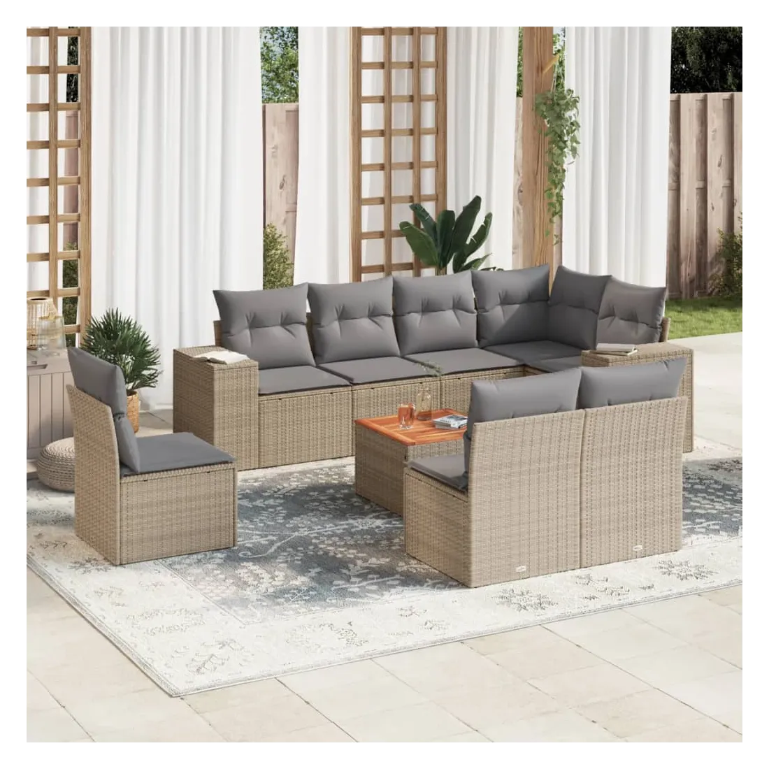 Cet ensemble de canapés de jardin est le complément parfait de votre arrière-cour, terrasse ou patio, offrant un espace confortable et accueillant pour discuter avec la famille et les amis ou simplement se détendre et profiter de l'extérieur. Matériau durable : la résine tressée, également connue sous le nom de poly rotin, est un matériau synthétique solide et nécessitant peu d'entretien qui ressemble au rotin naturel. Il est léger, facile à nettoyer et couramment utilisé pour les meubles d'extérieur en raison de sa durabilité et de ses propriétés de résistance aux intempéries. Fonction de rangement avec sac résistant à l'eau : chaque siège de jardin dispose d'un espace de rangement sous l'assise, complété par un sac résistant à l'eau pour ranger les coussins, les jouets et d'autres objets. Les sacs intérieurs sont dotés d'un couvercle et peuvent être solidement fixés aux sièges à l'aide de bandes auto-agrippantes pour plus de stabilité. Dessus stable et facile à nettoyer : cette table de jardin a un dessus en bois d'acacia robuste, durable et facile à nettoyer avec un chiffon humide. Expérience d'assise confortable : ce mobilier d'extérieur, doté de coussins épais, offre une expérience d'assise confortable. Conception modulaire : cet ensemble de meubles d'extérieur a une conception modulaire, ce qui le rend complètement flexible et facile à déplacer, afin que vous puissiez créer un agencement de meubles d'extérieur personnalisé. Bon à savoir :Pour que vos meubles d'extérieur restent beaux, nous vous recommandons de les protéger avec une housse imperméable.