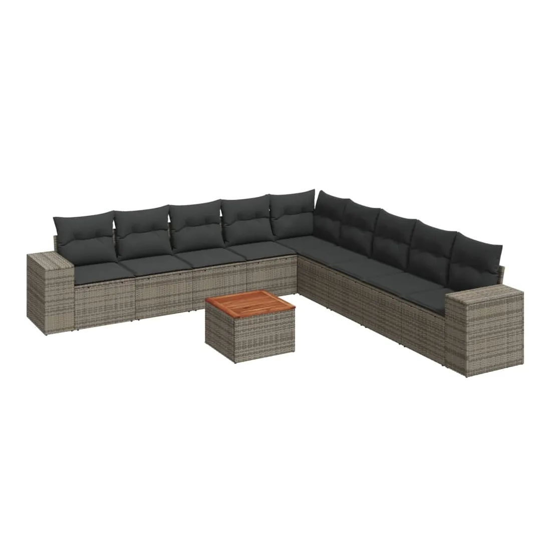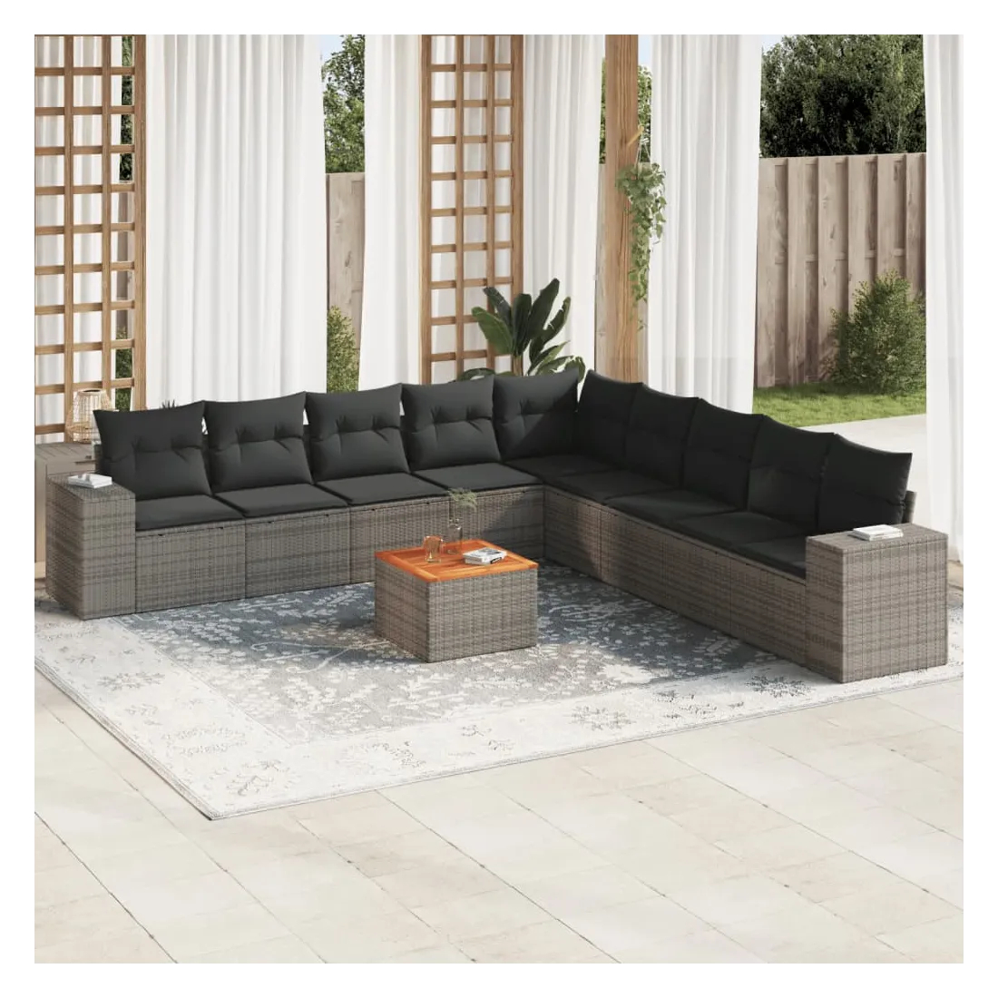 Cet ensemble de canapés de jardin est le complément parfait de votre arrière-cour, terrasse ou patio, offrant un espace confortable et accueillant pour discuter avec la famille et les amis ou simplement se détendre et profiter de l'extérieur. Matériau durable : la résine tressée, également connue sous le nom de poly rotin, est un matériau synthétique solide et nécessitant peu d'entretien qui ressemble au rotin naturel. Il est léger, facile à nettoyer et couramment utilisé pour les meubles d'extérieur en raison de sa durabilité et de ses propriétés de résistance aux intempéries. Fonction de rangement avec sac résistant à l'eau : chaque siège de jardin dispose d'un espace de rangement sous l'assise, complété par un sac résistant à l'eau pour ranger les coussins, les jouets et d'autres objets. Les sacs intérieurs sont dotés d'un couvercle et peuvent être solidement fixés aux sièges à l'aide de bandes auto-agrippantes pour plus de stabilité. Dessus stable et facile à nettoyer : cette table de jardin a un dessus en bois d'acacia robuste, durable et facile à nettoyer avec un chiffon humide. Expérience d'assise confortable : ce mobilier d'extérieur, doté de coussins épais, offre une expérience d'assise confortable. Conception modulaire : cet ensemble de meubles d'extérieur a une conception modulaire, ce qui le rend complètement flexible et facile à déplacer, afin que vous puissiez créer un agencement de meubles d'extérieur personnalisé. Bon à savoir :Pour que vos meubles d'extérieur restent beaux, nous vous recommandons de les protéger avec une housse imperméable.