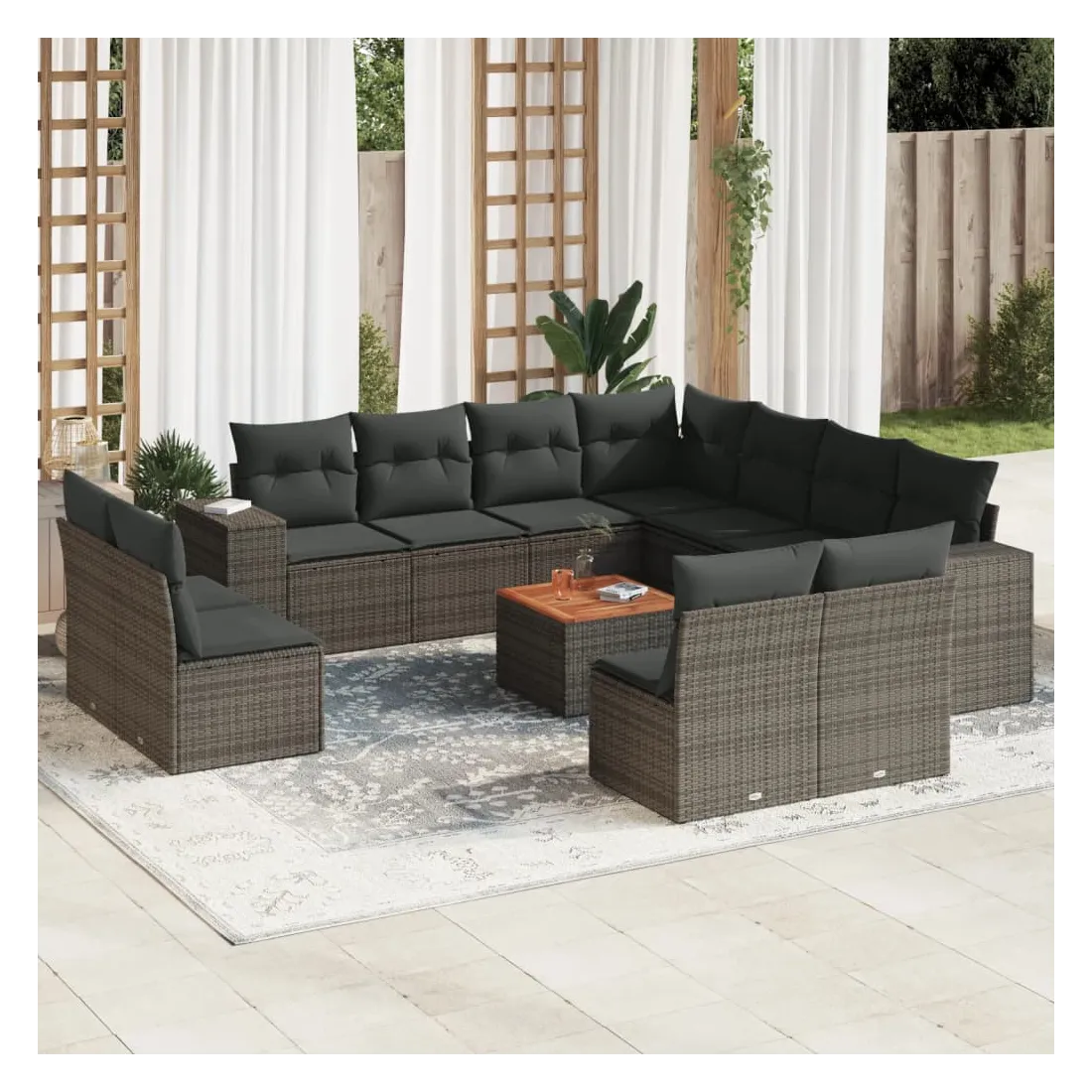 Cet ensemble de canapés de jardin est le complément parfait de votre arrière-cour, terrasse ou patio, offrant un espace confortable et accueillant pour discuter avec la famille et les amis ou simplement se détendre et profiter de l'extérieur. Matériau durable : la résine tressée, également connue sous le nom de poly rotin, est un matériau synthétique solide et nécessitant peu d'entretien qui ressemble au rotin naturel. Il est léger, facile à nettoyer et couramment utilisé pour les meubles d'extérieur en raison de sa durabilité et de ses propriétés de résistance aux intempéries. Fonction de rangement avec sac résistant à l'eau : chaque siège de jardin dispose d'un espace de rangement sous l'assise, complété par un sac résistant à l'eau pour ranger les coussins, les jouets et d'autres objets. Les sacs intérieurs sont dotés d'un couvercle et peuvent être solidement fixés aux sièges à l'aide de bandes auto-agrippantes pour plus de stabilité. Dessus stable et facile à nettoyer : cette table de jardin a un dessus en bois d'acacia robuste, durable et facile à nettoyer avec un chiffon humide. Expérience d'assise confortable : ce mobilier d'extérieur, doté de coussins épais, offre une expérience d'assise confortable. Conception modulaire : cet ensemble de meubles d'extérieur a une conception modulaire, ce qui le rend complètement flexible et facile à déplacer, afin que vous puissiez créer un agencement de meubles d'extérieur personnalisé. Bon à savoir :Pour que vos meubles d'extérieur restent beaux, nous vous recommandons de les protéger avec une housse imperméable.