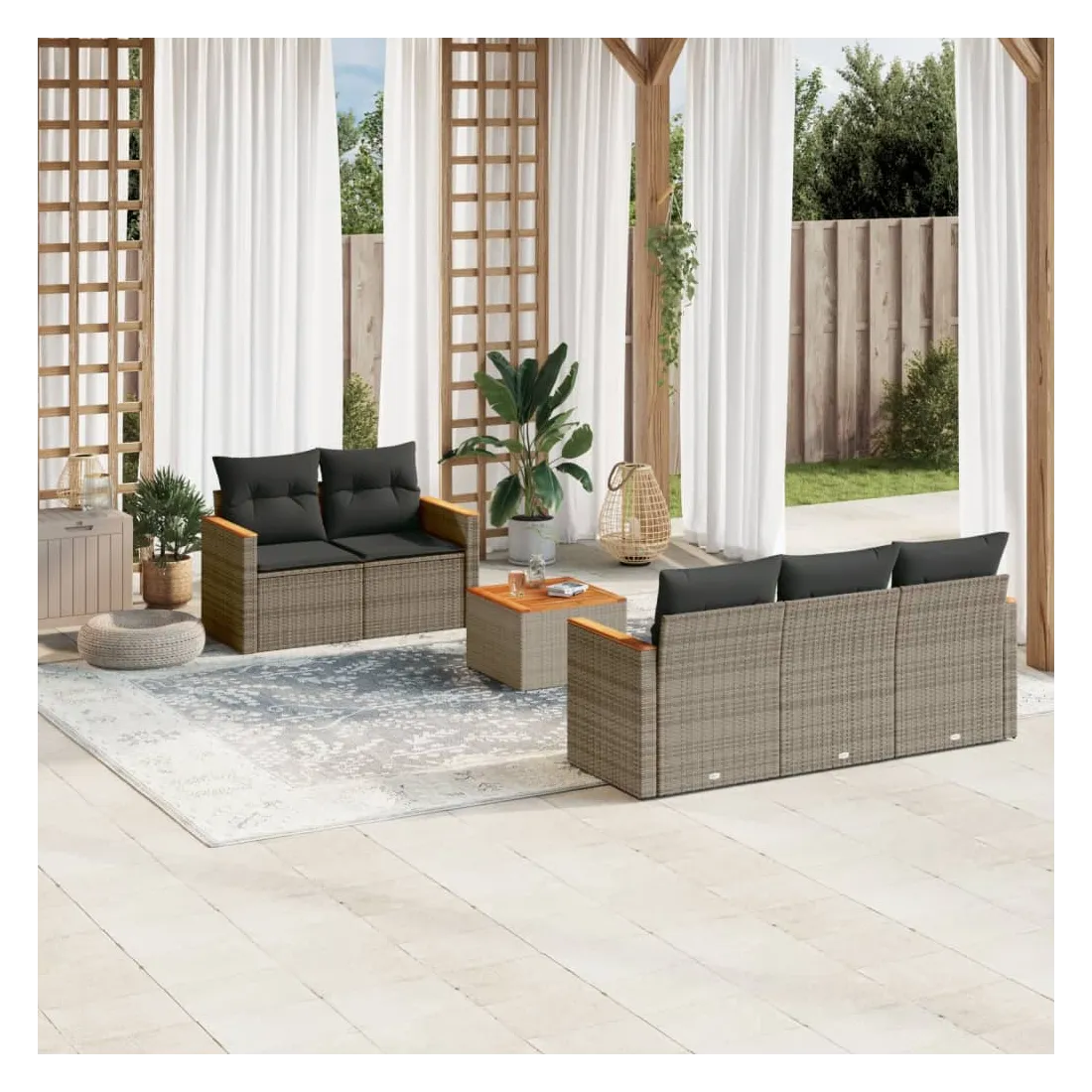 Cet ensemble de canapés de jardin est le complément parfait de votre arrière-cour, terrasse ou patio, offrant un espace confortable et accueillant pour discuter avec la famille et les amis ou simplement se détendre et profiter de l'extérieur. Matériau durable : la résine tressée, également connue sous le nom de poly rotin, est un matériau synthétique solide et nécessitant peu d'entretien qui ressemble au rotin naturel. Il est léger, facile à nettoyer et couramment utilisé pour les meubles d'extérieur en raison de sa durabilité et de ses propriétés de résistance aux intempéries.Fonction de rangement avec sac résistant à l'eau : le mobilier de jardin dispose d'un espace de rangement sous l'assise, complété par un sac résistant à l'eau pour ranger coussins, jouets et autres objets. Le sac intérieur peut être solidement fixé au mobilier d'extérieur grâce à des attaches auto-agrippantes pour plus de stabilité.Dessus stable et facile à nettoyer : cette table de jardin a un dessus en bois d'acacia robuste, durable et facile à nettoyer avec un chiffon humide.Housse amovible et lavable : ces coussins de siège sont dotés de housses amovibles pour un lavage et un entretien faciles.Conception modulaire : cet ensemble de meubles d'extérieur a une conception modulaire, ce qui le rend complètement flexible et facile à déplacer, afin que vous puissiez créer un agencement de meubles d'extérieur personnalisé. Bon à savoir :Pour que vos meubles d'extérieur restent beaux, nous vous recommandons de les protéger avec une housse imperméable.