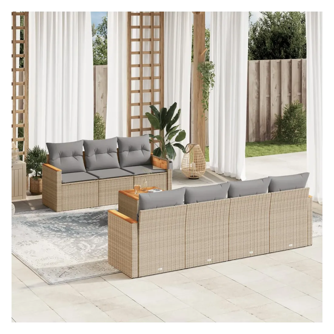 Cet ensemble de canapés de jardin est le complément parfait de votre arrière-cour, terrasse ou patio, offrant un espace confortable et accueillant pour discuter avec la famille et les amis ou simplement se détendre et profiter de l'extérieur. Matériau durable : la résine tressée, également connue sous le nom de poly rotin, est un matériau synthétique solide et nécessitant peu d'entretien qui ressemble au rotin naturel. Il est léger, facile à nettoyer et couramment utilisé pour les meubles d'extérieur en raison de sa durabilité et de ses propriétés de résistance aux intempéries.Fonction de rangement avec sac résistant à l'eau : le mobilier de jardin dispose d'un espace de rangement sous l'assise, complété par un sac résistant à l'eau pour ranger coussins, jouets et autres objets. Le sac intérieur peut être solidement fixé au mobilier d'extérieur grâce à des attaches auto-agrippantes pour plus de stabilité.Dessus stable et facile à nettoyer : cette table de jardin a un dessus en bois d'acacia robuste, durable et facile à nettoyer avec un chiffon humide.Housse amovible et lavable : ces coussins de siège sont dotés de housses amovibles pour un lavage et un entretien faciles.Conception modulaire : cet ensemble de meubles d'extérieur a une conception modulaire, ce qui le rend complètement flexible et facile à déplacer, afin que vous puissiez créer un agencement de meubles d'extérieur personnalisé. Bon à savoir :Pour que vos meubles d'extérieur restent beaux, nous vous recommandons de les protéger avec une housse imperméable.