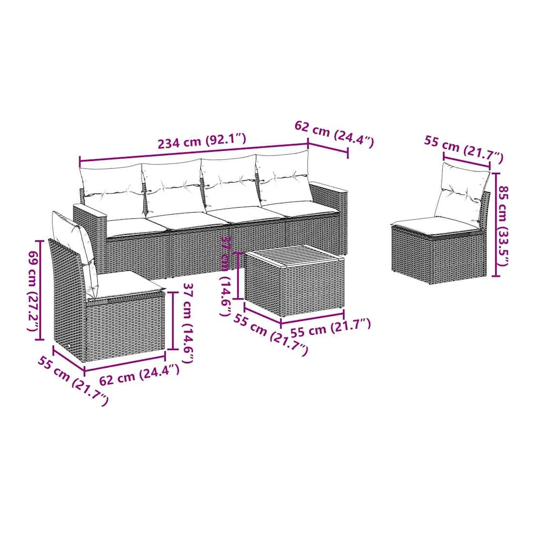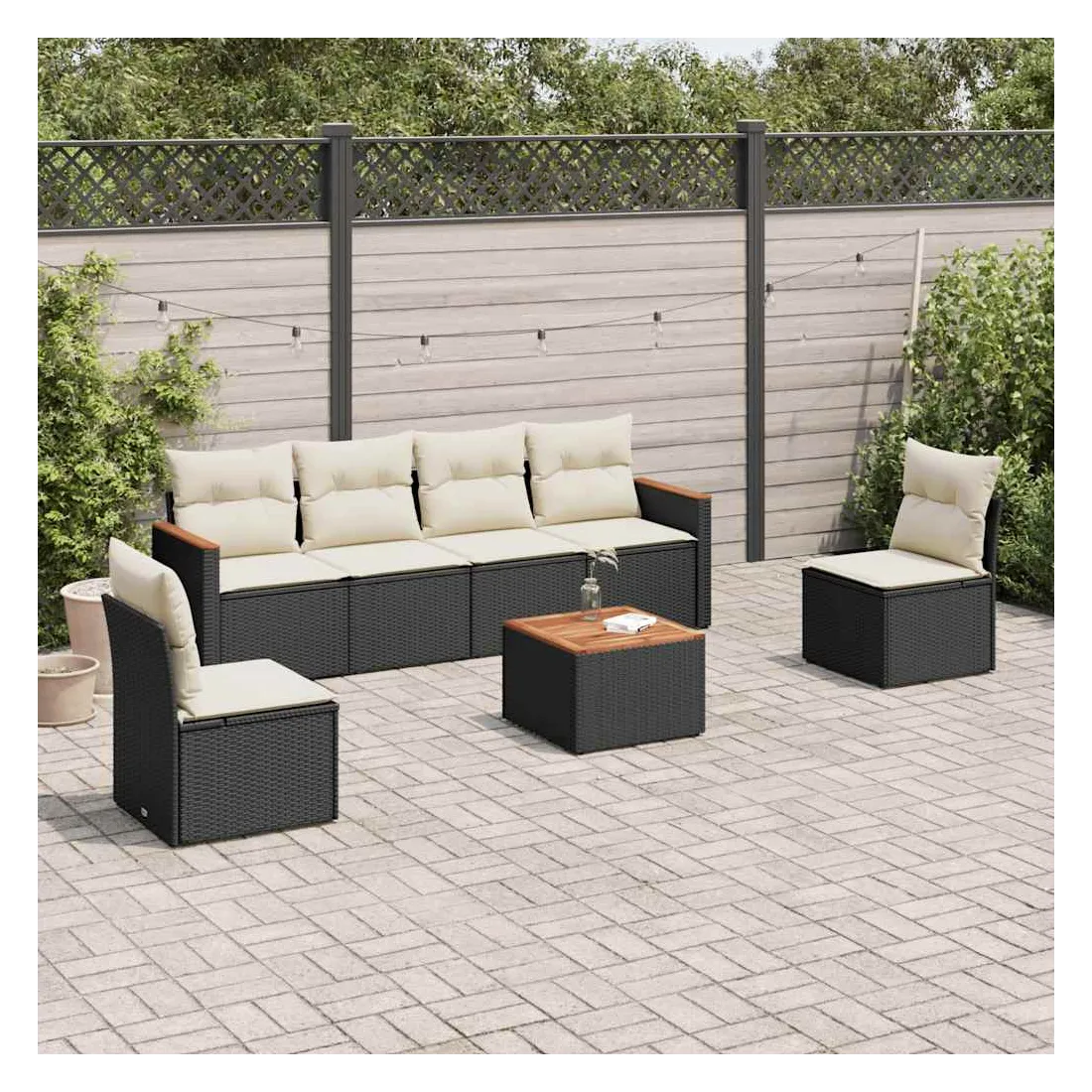 Cet ensemble de canapés de jardin est le complément parfait de votre arrière-cour, terrasse ou patio, offrant un espace confortable et accueillant pour discuter avec la famille et les amis ou simplement se détendre et profiter de l'extérieur. Matériau durable : la résine tressée, également connue sous le nom de poly rotin, est un matériau synthétique solide et nécessitant peu d'entretien qui ressemble au rotin naturel. Il est léger, facile à nettoyer et couramment utilisé pour les meubles d'extérieur en raison de sa durabilité et de ses propriétés de résistance aux intempéries.Fonction de rangement avec sac résistant à l'eau : le mobilier de jardin dispose d'un espace de rangement sous l'assise, complété par un sac résistant à l'eau pour ranger coussins, jouets et autres objets. Le sac intérieur peut être solidement fixé au mobilier d'extérieur grâce à des attaches auto-agrippantes pour plus de stabilité.Dessus stable et facile à nettoyer : cette table de jardin a un dessus en bois d'acacia robuste, durable et facile à nettoyer avec un chiffon humide.Housse amovible et lavable : ces coussins de siège sont dotés de housses amovibles pour un lavage et un entretien faciles.Conception modulaire : cet ensemble de meubles d'extérieur a une conception modulaire, ce qui le rend complètement flexible et facile à déplacer, afin que vous puissiez créer un agencement de meubles d'extérieur personnalisé. Bon à savoir :Pour que vos meubles d'extérieur restent beaux, nous vous recommandons de les protéger avec une housse imperméable.