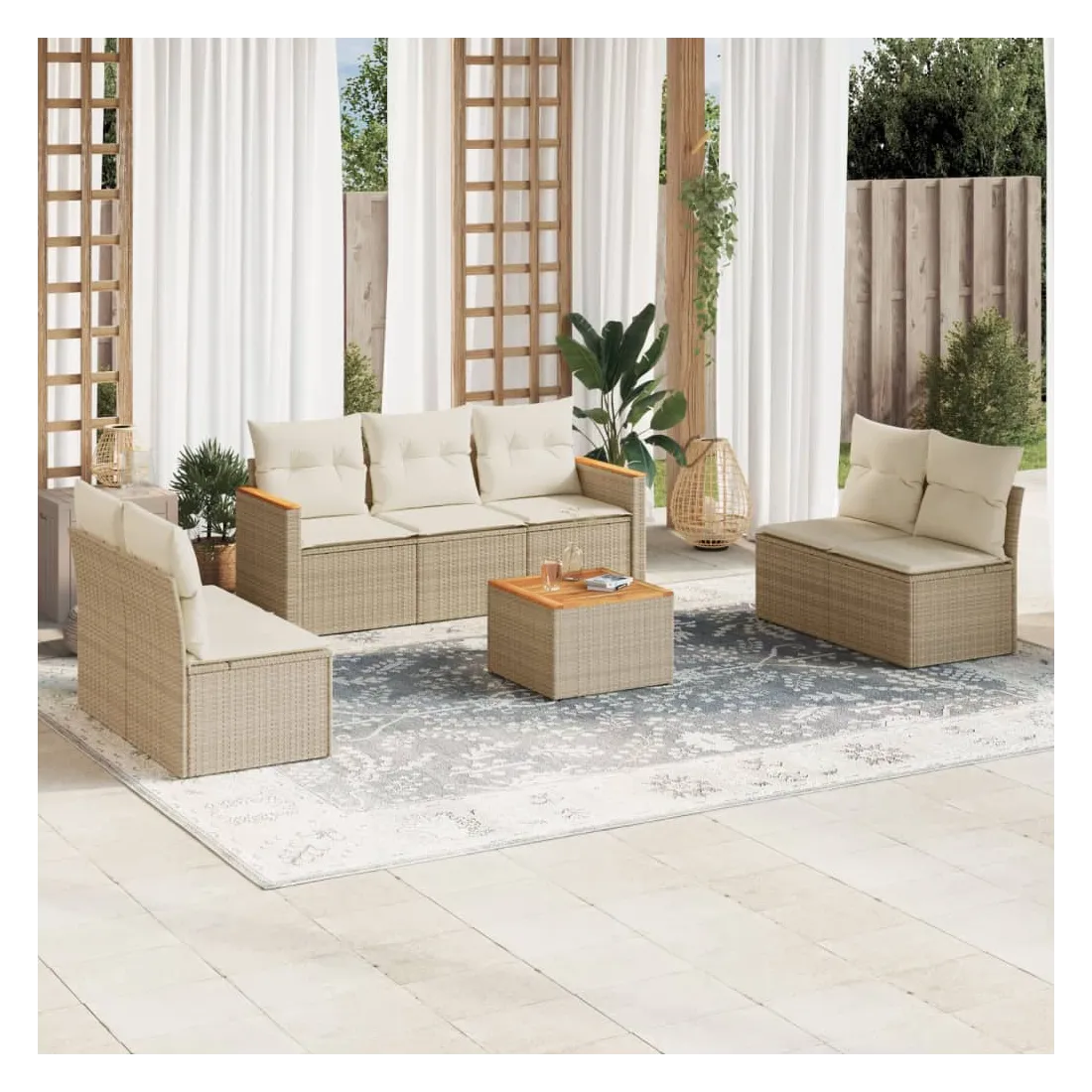 Cet ensemble de canapés de jardin est le complément parfait de votre arrière-cour, terrasse ou patio, offrant un espace confortable et accueillant pour discuter avec la famille et les amis ou simplement se détendre et profiter de l'extérieur. Matériau durable : la résine tressée, également connue sous le nom de poly rotin, est un matériau synthétique solide et nécessitant peu d'entretien qui ressemble au rotin naturel. Il est léger, facile à nettoyer et couramment utilisé pour les meubles d'extérieur en raison de sa durabilité et de ses propriétés de résistance aux intempéries.Fonction de rangement avec sac résistant à l'eau : le mobilier de jardin dispose d'un espace de rangement sous l'assise, complété par un sac résistant à l'eau pour ranger coussins, jouets et autres objets. Le sac intérieur peut être solidement fixé au mobilier d'extérieur grâce à des attaches auto-agrippantes pour plus de stabilité.Dessus stable et facile à nettoyer : cette table de jardin a un dessus en bois d'acacia robuste, durable et facile à nettoyer avec un chiffon humide.Housse amovible et lavable : ces coussins de siège sont dotés de housses amovibles pour un lavage et un entretien faciles.Conception modulaire : cet ensemble de meubles d'extérieur a une conception modulaire, ce qui le rend complètement flexible et facile à déplacer, afin que vous puissiez créer un agencement de meubles d'extérieur personnalisé. Bon à savoir :Pour que vos meubles d'extérieur restent beaux, nous vous recommandons de les protéger avec une housse imperméable.