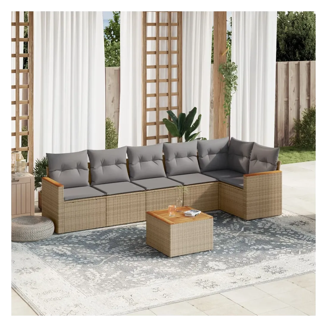 Cet ensemble de canapés de jardin est le complément parfait de votre arrière-cour, terrasse ou patio, offrant un espace confortable et accueillant pour discuter avec la famille et les amis ou simplement se détendre et profiter de l'extérieur. Matériau durable : la résine tressée, également connue sous le nom de poly rotin, est un matériau synthétique solide et nécessitant peu d'entretien qui ressemble au rotin naturel. Il est léger, facile à nettoyer et couramment utilisé pour les meubles d'extérieur en raison de sa durabilité et de ses propriétés de résistance aux intempéries.Fonction de rangement avec sac résistant à l'eau : le mobilier de jardin dispose d'un espace de rangement sous l'assise, complété par un sac résistant à l'eau pour ranger coussins, jouets et autres objets. Le sac intérieur peut être solidement fixé au mobilier d'extérieur grâce à des attaches auto-agrippantes pour plus de stabilité.Dessus stable et facile à nettoyer : cette table de jardin a un dessus en bois d'acacia robuste, durable et facile à nettoyer avec un chiffon humide.Housse amovible et lavable : ces coussins de siège sont dotés de housses amovibles pour un lavage et un entretien faciles.Conception modulaire : cet ensemble de meubles d'extérieur a une conception modulaire, ce qui le rend complètement flexible et facile à déplacer, afin que vous puissiez créer un agencement de meubles d'extérieur personnalisé. Bon à savoir :Pour que vos meubles d'extérieur restent beaux, nous vous recommandons de les protéger avec une housse imperméable.