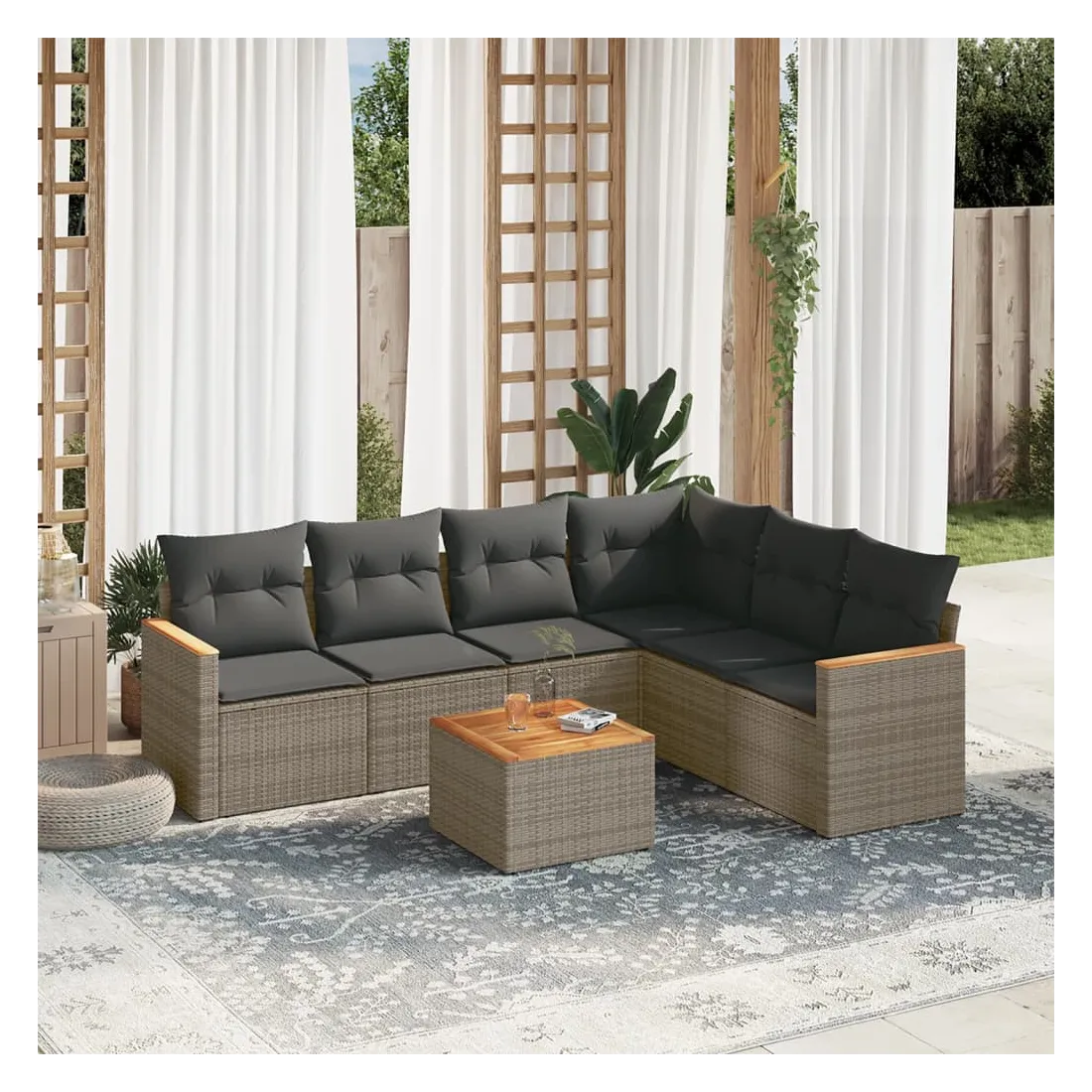 Cet ensemble de canapés de jardin est le complément parfait de votre arrière-cour, terrasse ou patio, offrant un espace confortable et accueillant pour discuter avec la famille et les amis ou simplement se détendre et profiter de l'extérieur. Matériau durable : la résine tressée, également connue sous le nom de poly rotin, est un matériau synthétique solide et nécessitant peu d'entretien qui ressemble au rotin naturel. Il est léger, facile à nettoyer et couramment utilisé pour les meubles d'extérieur en raison de sa durabilité et de ses propriétés de résistance aux intempéries.Fonction de rangement avec sac résistant à l'eau : le mobilier de jardin dispose d'un espace de rangement sous l'assise, complété par un sac résistant à l'eau pour ranger coussins, jouets et autres objets. Le sac intérieur peut être solidement fixé au mobilier d'extérieur grâce à des attaches auto-agrippantes pour plus de stabilité.Dessus stable et facile à nettoyer : cette table de jardin a un dessus en bois d'acacia robuste, durable et facile à nettoyer avec un chiffon humide.Housse amovible et lavable : ces coussins de siège sont dotés de housses amovibles pour un lavage et un entretien faciles.Conception modulaire : cet ensemble de meubles d'extérieur a une conception modulaire, ce qui le rend complètement flexible et facile à déplacer, afin que vous puissiez créer un agencement de meubles d'extérieur personnalisé. Bon à savoir :Pour que vos meubles d'extérieur restent beaux, nous vous recommandons de les protéger avec une housse imperméable.