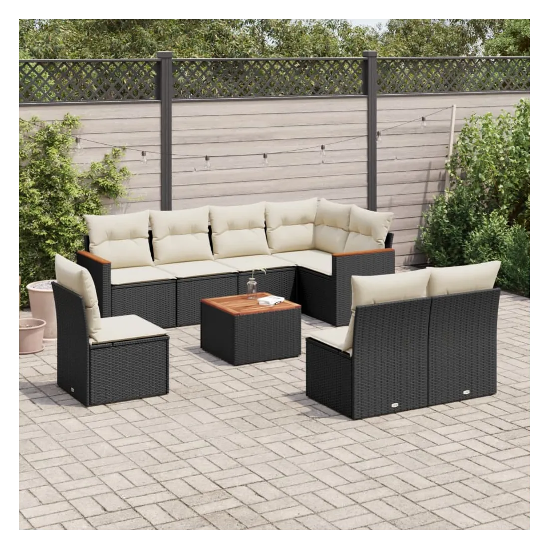 Cet ensemble de canapés de jardin est le complément parfait de votre arrière-cour, terrasse ou patio, offrant un espace confortable et accueillant pour discuter avec la famille et les amis ou simplement se détendre et profiter de l'extérieur. Matériau durable : la résine tressée, également connue sous le nom de poly rotin, est un matériau synthétique solide et nécessitant peu d'entretien qui ressemble au rotin naturel. Il est léger, facile à nettoyer et couramment utilisé pour les meubles d'extérieur en raison de sa durabilité et de ses propriétés de résistance aux intempéries.Fonction de rangement avec sac résistant à l'eau : le mobilier de jardin dispose d'un espace de rangement sous l'assise, complété par un sac résistant à l'eau pour ranger coussins, jouets et autres objets. Le sac intérieur peut être solidement fixé au mobilier d'extérieur grâce à des attaches auto-agrippantes pour plus de stabilité.Dessus stable et facile à nettoyer : cette table de jardin a un dessus en bois d'acacia robuste, durable et facile à nettoyer avec un chiffon humide.Housse amovible et lavable : ces coussins de siège sont dotés de housses amovibles pour un lavage et un entretien faciles.Conception modulaire : cet ensemble de meubles d'extérieur a une conception modulaire, ce qui le rend complètement flexible et facile à déplacer, afin que vous puissiez créer un agencement de meubles d'extérieur personnalisé. Bon à savoir :Pour que vos meubles d'extérieur restent beaux, nous vous recommandons de les protéger avec une housse imperméable.
