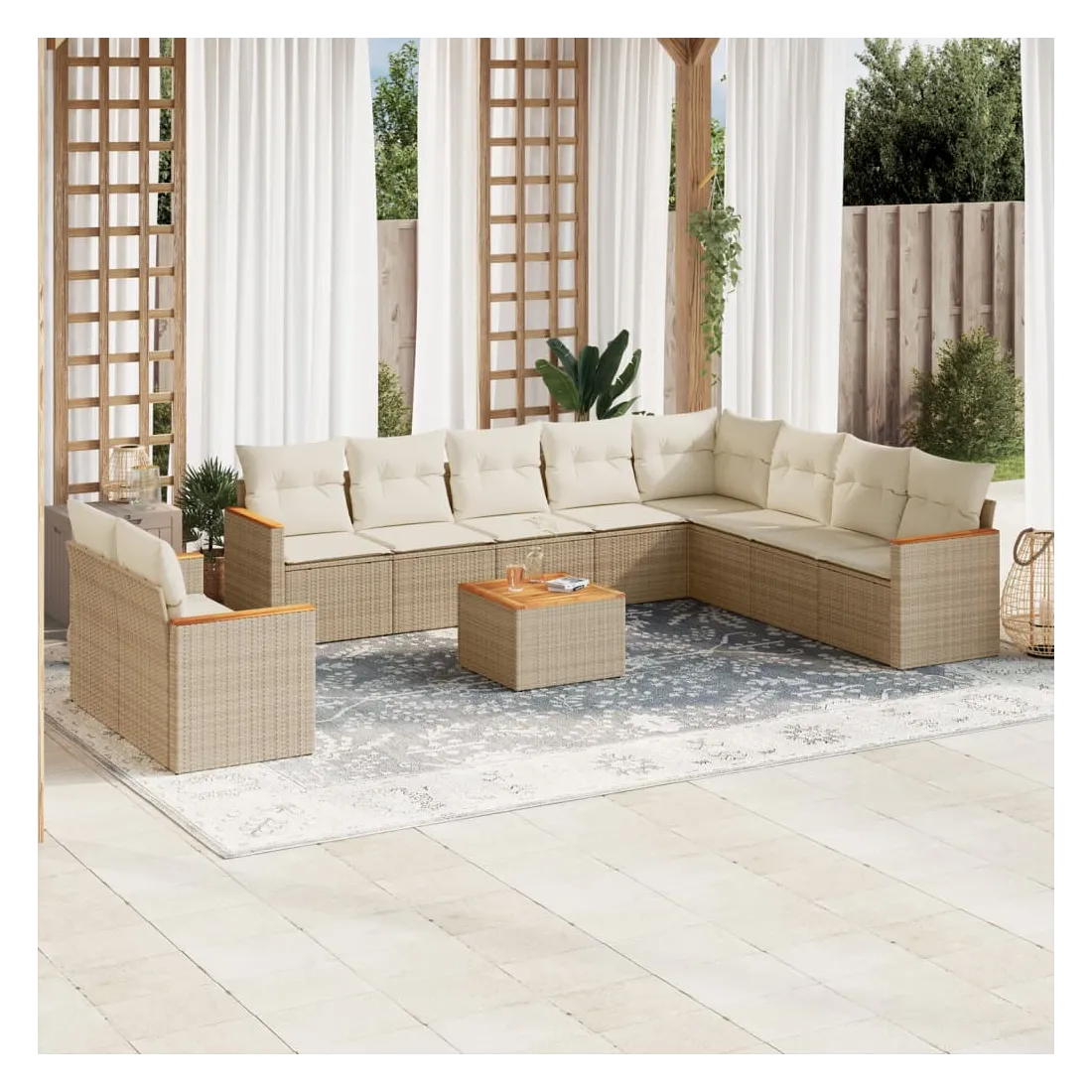 Cet ensemble de canapés de jardin est le complément parfait de votre arrière-cour, terrasse ou patio, offrant un espace confortable et accueillant pour discuter avec la famille et les amis ou simplement se détendre et profiter de l'extérieur. Matériau durable : la résine tressée, également connue sous le nom de poly rotin, est un matériau synthétique solide et nécessitant peu d'entretien qui ressemble au rotin naturel. Il est léger, facile à nettoyer et couramment utilisé pour les meubles d'extérieur en raison de sa durabilité et de ses propriétés de résistance aux intempéries.Fonction de rangement avec sac résistant à l'eau : le mobilier de jardin dispose d'un espace de rangement sous l'assise, complété par un sac résistant à l'eau pour ranger coussins, jouets et autres objets. Le sac intérieur peut être solidement fixé au mobilier d'extérieur grâce à des attaches auto-agrippantes pour plus de stabilité.Dessus stable et facile à nettoyer : cette table de jardin a un dessus en bois d'acacia robuste, durable et facile à nettoyer avec un chiffon humide.Housse amovible et lavable : ces coussins de siège sont dotés de housses amovibles pour un lavage et un entretien faciles.Conception modulaire : cet ensemble de meubles d'extérieur a une conception modulaire, ce qui le rend complètement flexible et facile à déplacer, afin que vous puissiez créer un agencement de meubles d'extérieur personnalisé. Bon à savoir :Pour que vos meubles d'extérieur restent beaux, nous vous recommandons de les protéger avec une housse imperméable.