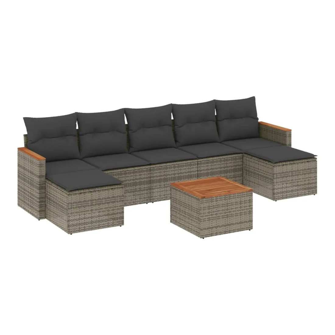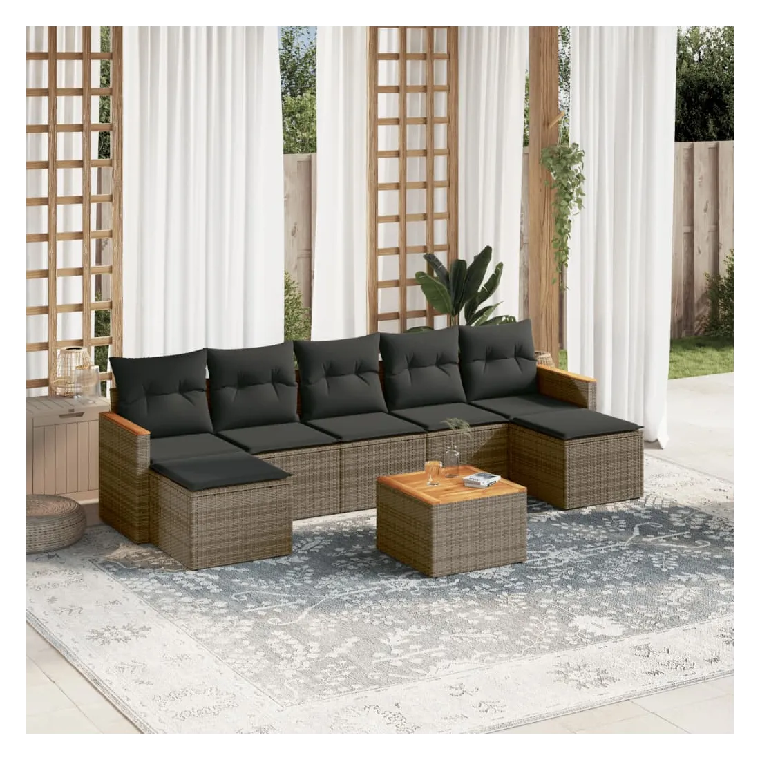 Cet ensemble de canapés de jardin est le complément parfait de votre arrière-cour, terrasse ou patio, offrant un espace confortable et accueillant pour discuter avec la famille et les amis ou simplement se détendre et profiter de l'extérieur. Matériau durable : la résine tressée, également connue sous le nom de poly rotin, est un matériau synthétique solide et nécessitant peu d'entretien qui ressemble au rotin naturel. Il est léger, facile à nettoyer et couramment utilisé pour les meubles d'extérieur en raison de sa durabilité et de ses propriétés de résistance aux intempéries.Fonction de rangement avec sac résistant à l'eau : le mobilier de jardin dispose d'un espace de rangement sous l'assise, complété par un sac résistant à l'eau pour ranger coussins, jouets et autres objets. Le sac intérieur peut être solidement fixé au mobilier d'extérieur grâce à des attaches auto-agrippantes pour plus de stabilité.Dessus stable et facile à nettoyer : cette table de jardin a un dessus en bois d'acacia robuste, durable et facile à nettoyer avec un chiffon humide.Housse amovible et lavable : ces coussins de siège sont dotés de housses amovibles pour un lavage et un entretien faciles.Conception modulaire : cet ensemble de meubles d'extérieur a une conception modulaire, ce qui le rend complètement flexible et facile à déplacer, afin que vous puissiez créer un agencement de meubles d'extérieur personnalisé. Bon à savoir :Pour que vos meubles d'extérieur restent beaux, nous vous recommandons de les protéger avec une housse imperméable.