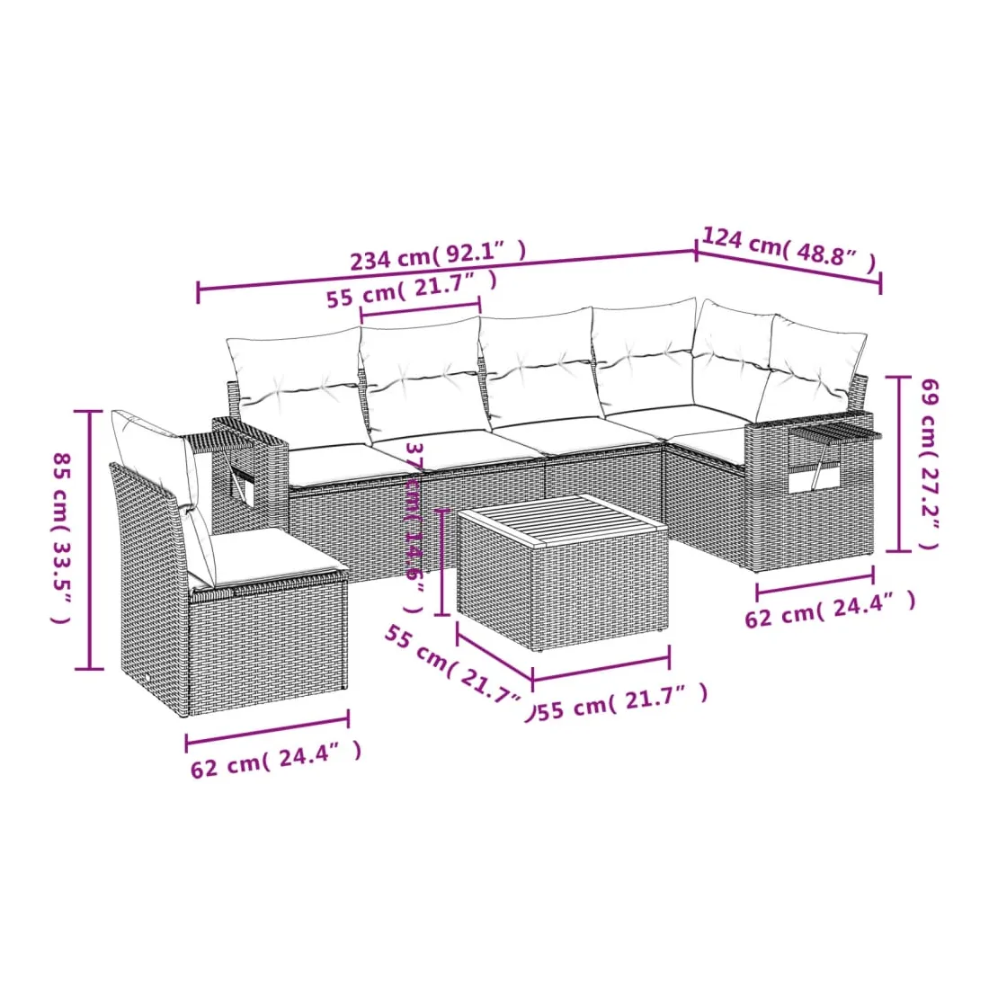 Cet ensemble de canapés de jardin est le complément parfait de votre arrière-cour, terrasse ou patio, offrant un espace confortable et accueillant pour discuter avec la famille et les amis ou simplement se détendre et profiter de l'extérieur. Matériau durable : la résine tressée, également connue sous le nom de poly rotin, est un matériau synthétique solide et nécessitant peu d'entretien qui ressemble au rotin naturel. Il est léger, facile à nettoyer et couramment utilisé pour les meubles d'extérieur en raison de sa durabilité et de ses propriétés de résistance aux intempéries.Fonction de rangement avec sac résistant à l'eau : le mobilier de jardin dispose d'un espace de rangement sous l'assise, complété par un sac résistant à l'eau pour ranger coussins, jouets et autres objets. Le sac intérieur peut être solidement fixé au mobilier d'extérieur grâce à des attaches auto-agrippantes pour plus de stabilité.Table d'appoint pratique : ce mobilier d'extérieur comprend une table d'appoint pliable avec un ressort à gaz sur les accoudoirs, offrant un endroit pratique pour garder vos essentiels à portée de main.Housse amovible et lavable : ces coussins de siège sont dotés de housses amovibles pour un lavage et un entretien faciles.Conception modulaire : cet ensemble de meubles d'extérieur a une conception modulaire, ce qui le rend complètement flexible et facile à déplacer, afin que vous puissiez créer un agencement de meubles d'extérieur personnalisé. Bon à savoir :Pour que vos meubles d'extérieur restent beaux, nous vous recommandons de les protéger avec une housse imperméable.