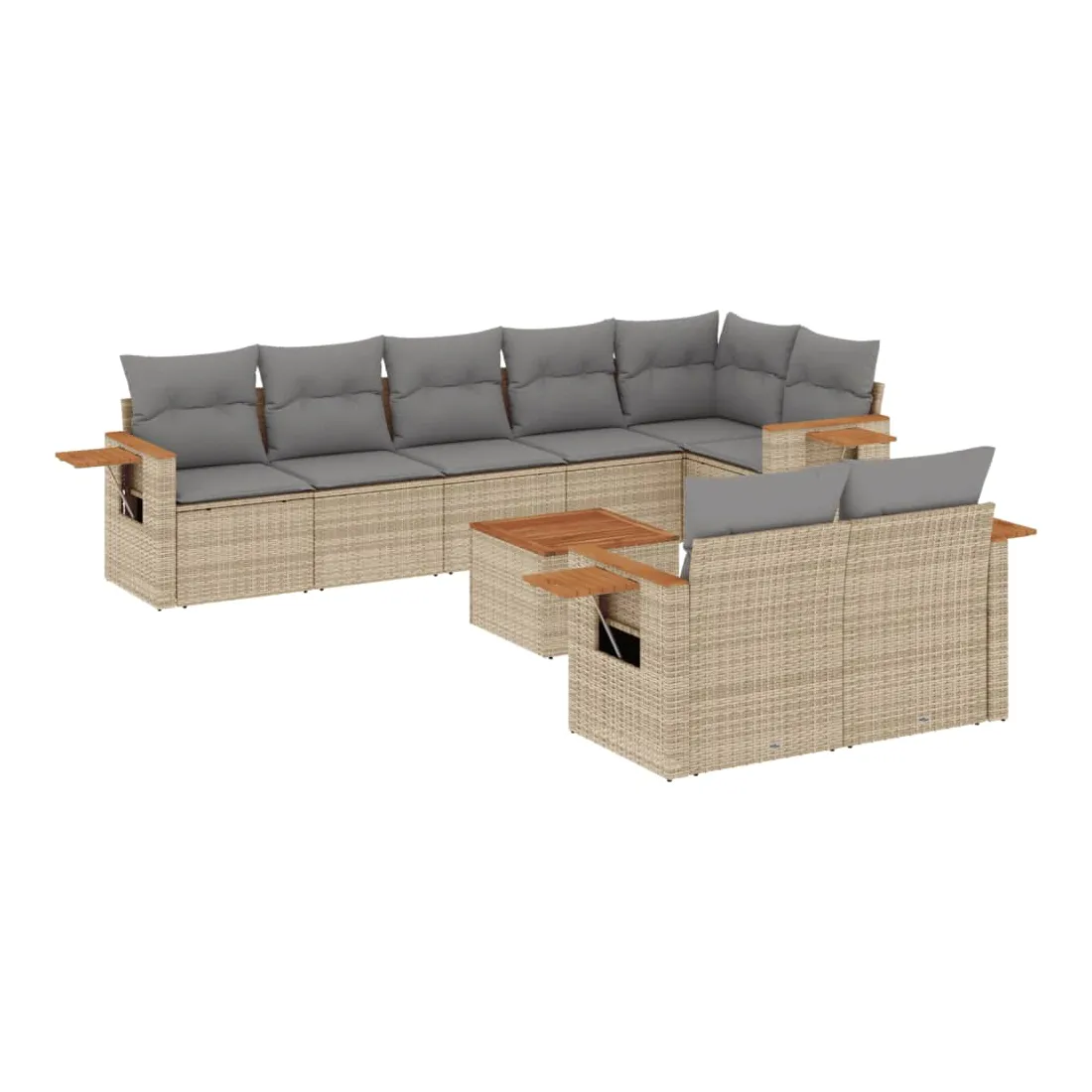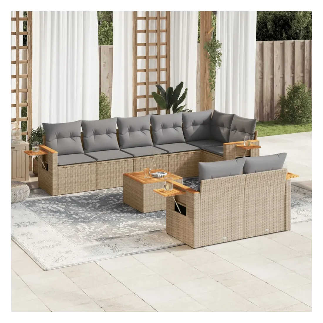 Cet ensemble de canapés de jardin est le complément parfait de votre arrière-cour, terrasse ou patio, offrant un espace confortable et accueillant pour discuter avec la famille et les amis ou simplement se détendre et profiter de l'extérieur. Matériau durable : la résine tressée, également connue sous le nom de poly rotin, est un matériau synthétique solide et nécessitant peu d'entretien qui ressemble au rotin naturel. Il est léger, facile à nettoyer et couramment utilisé pour les meubles d'extérieur en raison de sa durabilité et de ses propriétés de résistance aux intempéries.Fonction de rangement avec sac résistant à l'eau : le mobilier de jardin dispose d'un espace de rangement sous l'assise, complété par un sac résistant à l'eau pour ranger coussins, jouets et autres objets. Le sac intérieur peut être solidement fixé au mobilier d'extérieur grâce à des attaches auto-agrippantes pour plus de stabilité.Table d'appoint pratique : ce mobilier d'extérieur comprend une table d'appoint pliable avec un ressort à gaz sur les accoudoirs, offrant un endroit pratique pour garder vos essentiels à portée de main.Housse amovible et lavable : ces coussins de siège sont dotés de housses amovibles pour un lavage et un entretien faciles.Conception modulaire : cet ensemble de meubles d'extérieur a une conception modulaire, ce qui le rend complètement flexible et facile à déplacer, afin que vous puissiez créer un agencement de meubles d'extérieur personnalisé. Bon à savoir :Pour que vos meubles d'extérieur restent beaux, nous vous recommandons de les protéger avec une housse imperméable.