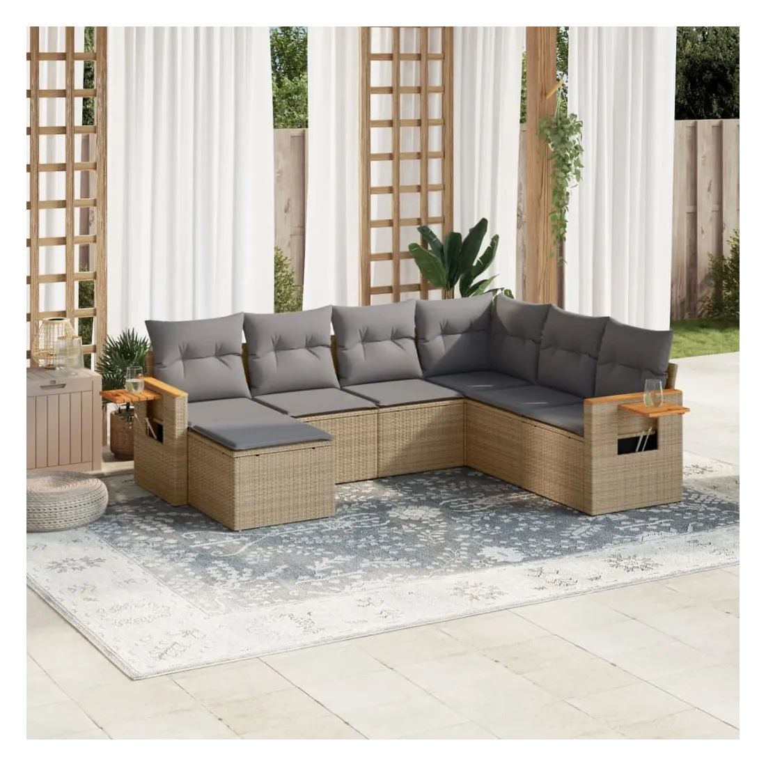 Cet ensemble de canapés de jardin est le complément parfait de votre arrière-cour, terrasse ou patio, offrant un espace confortable et accueillant pour discuter avec la famille et les amis ou simplement se détendre et profiter de l'extérieur. Matériau durable : la résine tressée, également connue sous le nom de poly rotin, est un matériau synthétique solide et nécessitant peu d'entretien qui ressemble au rotin naturel. Il est léger, facile à nettoyer et couramment utilisé pour les meubles d'extérieur en raison de sa durabilité et de ses propriétés de résistance aux intempéries.Fonction de rangement avec sac résistant à l'eau : le mobilier de jardin dispose d'un espace de rangement sous l'assise, complété par un sac résistant à l'eau pour ranger coussins, jouets et autres objets. Le sac intérieur peut être solidement fixé au mobilier d'extérieur grâce à des attaches auto-agrippantes pour plus de stabilité.Table d'appoint pratique : ce mobilier d'extérieur comprend une table d'appoint pliable avec un ressort à gaz sur les accoudoirs, offrant un endroit pratique pour garder vos essentiels à portée de main.Housse amovible et lavable : ces coussins de siège sont dotés de housses amovibles pour un lavage et un entretien faciles.Conception modulaire : cet ensemble de meubles d'extérieur a une conception modulaire, ce qui le rend complètement flexible et facile à déplacer, afin que vous puissiez créer un agencement de meubles d'extérieur personnalisé. Bon à savoir :Pour que vos meubles d'extérieur restent beaux, nous vous recommandons de les protéger avec une housse imperméable.