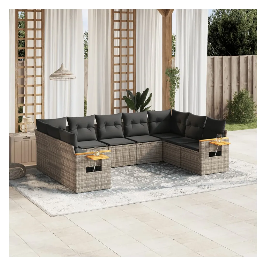 Cet ensemble de canapés de jardin est le complément parfait de votre arrière-cour, terrasse ou patio, offrant un espace confortable et accueillant pour discuter avec la famille et les amis ou simplement se détendre et profiter de l'extérieur. Matériau durable : la résine tressée, également connue sous le nom de poly rotin, est un matériau synthétique solide et nécessitant peu d'entretien qui ressemble au rotin naturel. Il est léger, facile à nettoyer et couramment utilisé pour les meubles d'extérieur en raison de sa durabilité et de ses propriétés de résistance aux intempéries.Fonction de rangement avec sac résistant à l'eau : le mobilier de jardin dispose d'un espace de rangement sous l'assise, complété par un sac résistant à l'eau pour ranger coussins, jouets et autres objets. Le sac intérieur peut être solidement fixé au mobilier d'extérieur grâce à des attaches auto-agrippantes pour plus de stabilité.Table d'appoint pratique : ce mobilier d'extérieur comprend une table d'appoint pliable avec un ressort à gaz sur les accoudoirs, offrant un endroit pratique pour garder vos essentiels à portée de main.Housse amovible et lavable : ces coussins de siège sont dotés de housses amovibles pour un lavage et un entretien faciles.Conception modulaire : cet ensemble de meubles d'extérieur a une conception modulaire, ce qui le rend complètement flexible et facile à déplacer, afin que vous puissiez créer un agencement de meubles d'extérieur personnalisé. Bon à savoir :Pour que vos meubles d'extérieur restent beaux, nous vous recommandons de les protéger avec une housse imperméable.
