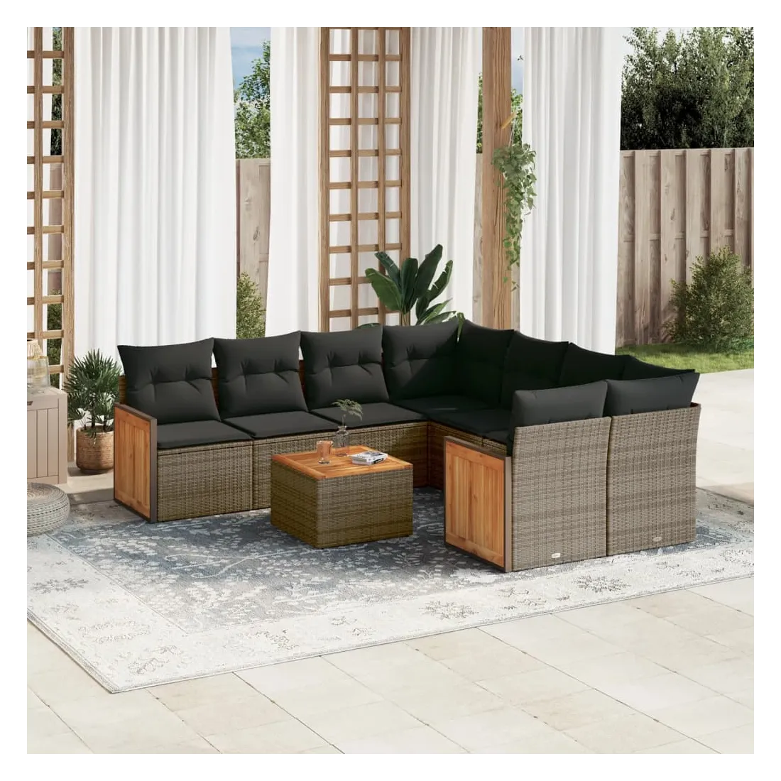 Cet ensemble de canapés de jardin est le complément parfait de votre arrière-cour, terrasse ou patio, offrant un espace confortable et accueillant pour discuter avec la famille et les amis ou simplement se détendre et profiter de l'extérieur. Matériau durable : la résine tressée, également connue sous le nom de poly rotin, est un matériau synthétique solide et nécessitant peu d'entretien qui ressemble au rotin naturel. Il est léger, facile à nettoyer et couramment utilisé pour les meubles d'extérieur en raison de sa durabilité et de ses propriétés de résistance aux intempéries.Fonction de rangement avec sac résistant à l'eau : le mobilier de jardin dispose d'un espace de rangement sous l'assise, complété par un sac résistant à l'eau pour ranger coussins, jouets et autres objets. Le sac intérieur peut être solidement fixé au mobilier d'extérieur grâce à des attaches auto-agrippantes pour plus de stabilité.Dessus stable et facile à nettoyer : cette table de jardin a un dessus en bois d'acacia robuste, durable et facile à nettoyer avec un chiffon humide.Housse amovible et lavable : ces coussins de siège sont dotés de housses amovibles pour un lavage et un entretien faciles.Conception modulaire : cet ensemble de meubles d'extérieur a une conception modulaire, ce qui le rend complètement flexible et facile à déplacer, afin que vous puissiez créer un agencement de meubles d'extérieur personnalisé. Bon à savoir :Pour que vos meubles d'extérieur restent beaux, nous vous recommandons de les protéger avec une housse imperméable.