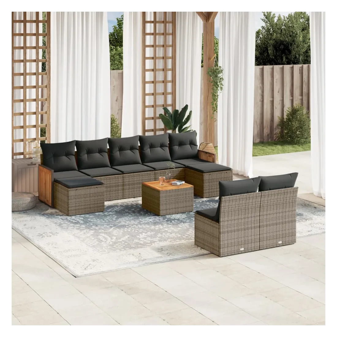 Cet ensemble de canapés de jardin est le complément parfait de votre arrière-cour, terrasse ou patio, offrant un espace confortable et accueillant pour discuter avec la famille et les amis ou simplement se détendre et profiter de l'extérieur. Matériau durable : la résine tressée, également connue sous le nom de poly rotin, est un matériau synthétique solide et nécessitant peu d'entretien qui ressemble au rotin naturel. Il est léger, facile à nettoyer et couramment utilisé pour les meubles d'extérieur en raison de sa durabilité et de ses propriétés de résistance aux intempéries.Fonction de rangement avec sac résistant à l'eau : le mobilier de jardin dispose d'un espace de rangement sous l'assise, complété par un sac résistant à l'eau pour ranger coussins, jouets et autres objets. Le sac intérieur peut être solidement fixé au mobilier d'extérieur grâce à des attaches auto-agrippantes pour plus de stabilité.Dessus stable et facile à nettoyer : cette table de jardin a un dessus en bois d'acacia robuste, durable et facile à nettoyer avec un chiffon humide.Housse amovible et lavable : ces coussins de siège sont dotés de housses amovibles pour un lavage et un entretien faciles.Conception modulaire : cet ensemble de meubles d'extérieur a une conception modulaire, ce qui le rend complètement flexible et facile à déplacer, afin que vous puissiez créer un agencement de meubles d'extérieur personnalisé. Bon à savoir :Pour que vos meubles d'extérieur restent beaux, nous vous recommandons de les protéger avec une housse imperméable.