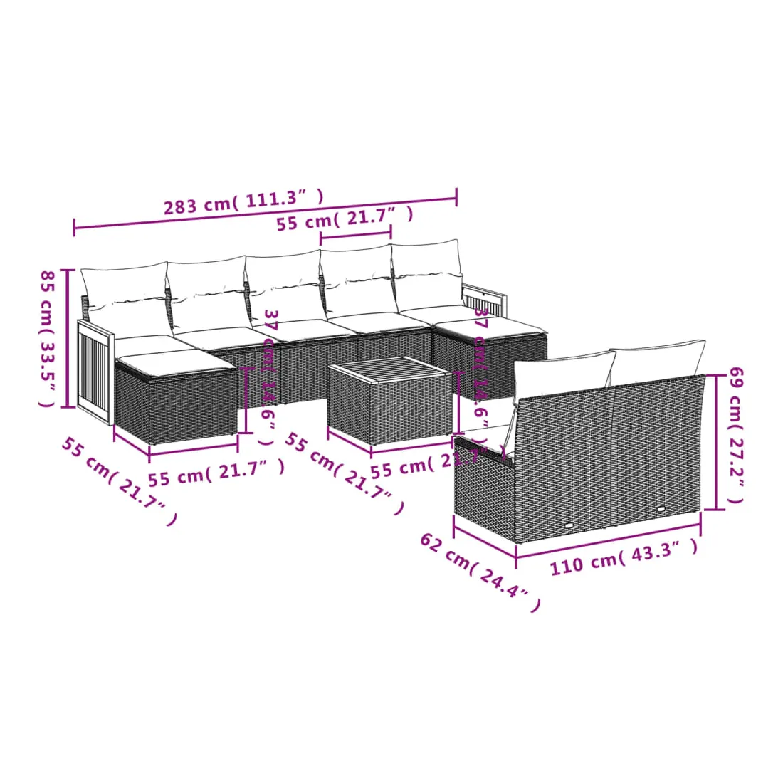 - 9 x coussin d'assise avec housse amovible et lavable