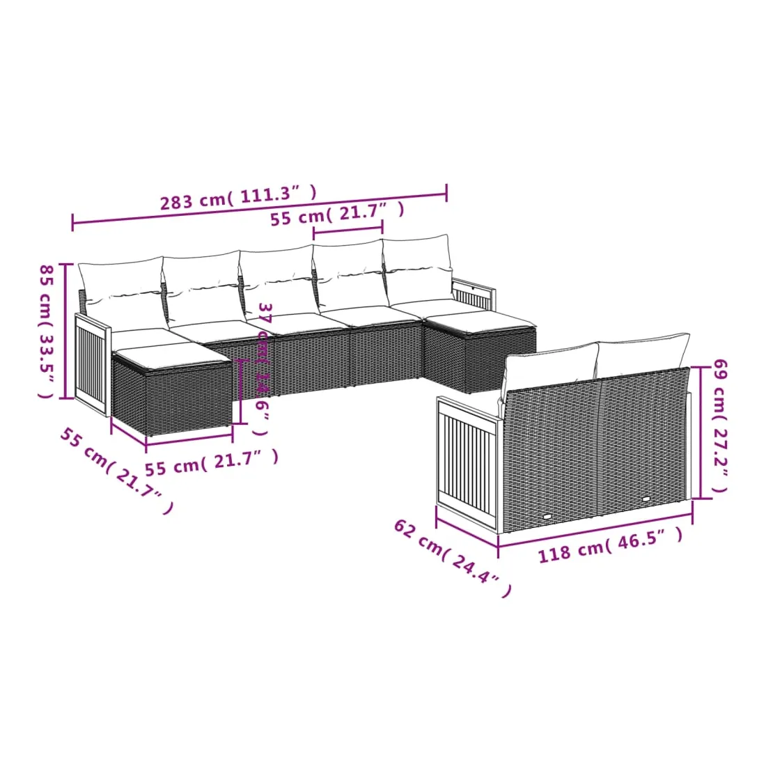 - 9 x coussin d'assise avec housse amovible et lavable