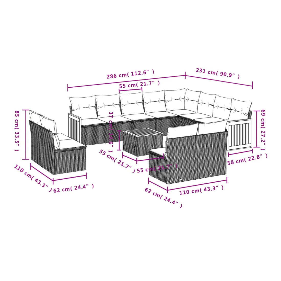 - Dimensions du coussin de dossier : 55 x 45 x 13 cm (L x l x é)