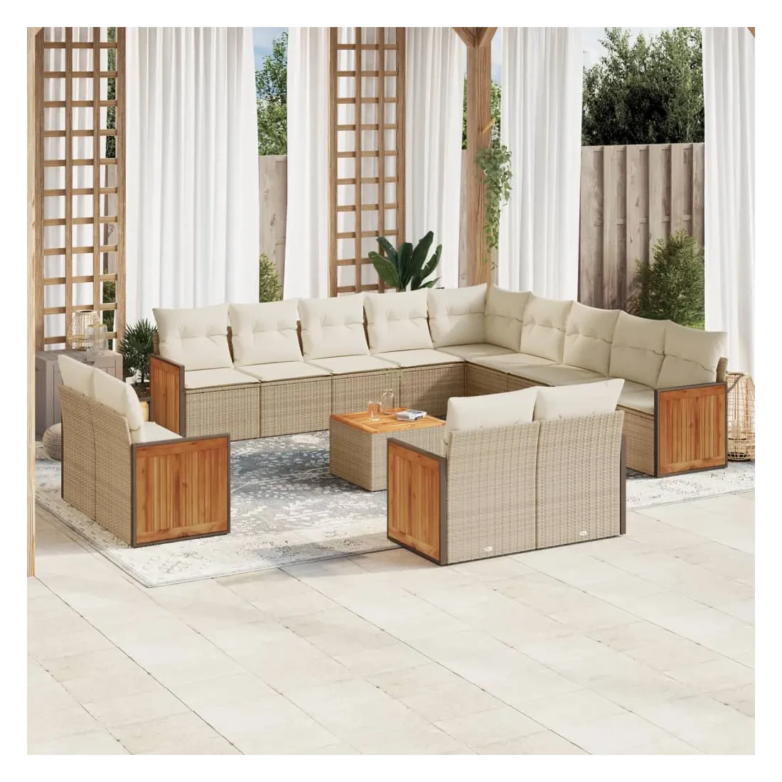 Cet ensemble de canapés de jardin est le complément parfait de votre arrière-cour, terrasse ou patio, offrant un espace confortable et accueillant pour discuter avec la famille et les amis ou simplement se détendre et profiter de l'extérieur. Matériau durable : la résine tressée, également connue sous le nom de poly rotin, est un matériau synthétique solide et nécessitant peu d'entretien qui ressemble au rotin naturel. Il est léger, facile à nettoyer et couramment utilisé pour les meubles d'extérieur en raison de sa durabilité et de ses propriétés de résistance aux intempéries.Fonction de rangement avec sac résistant à l'eau : le mobilier de jardin dispose d'un espace de rangement sous l'assise, complété par un sac résistant à l'eau pour ranger coussins, jouets et autres objets. Le sac intérieur peut être solidement fixé au mobilier d'extérieur grâce à des attaches auto-agrippantes pour plus de stabilité.Dessus stable et facile à nettoyer : cette table de jardin a un dessus en bois d'acacia robuste, durable et facile à nettoyer avec un chiffon humide.Housse amovible et lavable : ces coussins de siège sont dotés de housses amovibles pour un lavage et un entretien faciles.Conception modulaire : cet ensemble de meubles d'extérieur a une conception modulaire, ce qui le rend complètement flexible et facile à déplacer, afin que vous puissiez créer un agencement de meubles d'extérieur personnalisé. Bon à savoir :Pour que vos meubles d'extérieur restent beaux, nous vous recommandons de les protéger avec une housse imperméable.