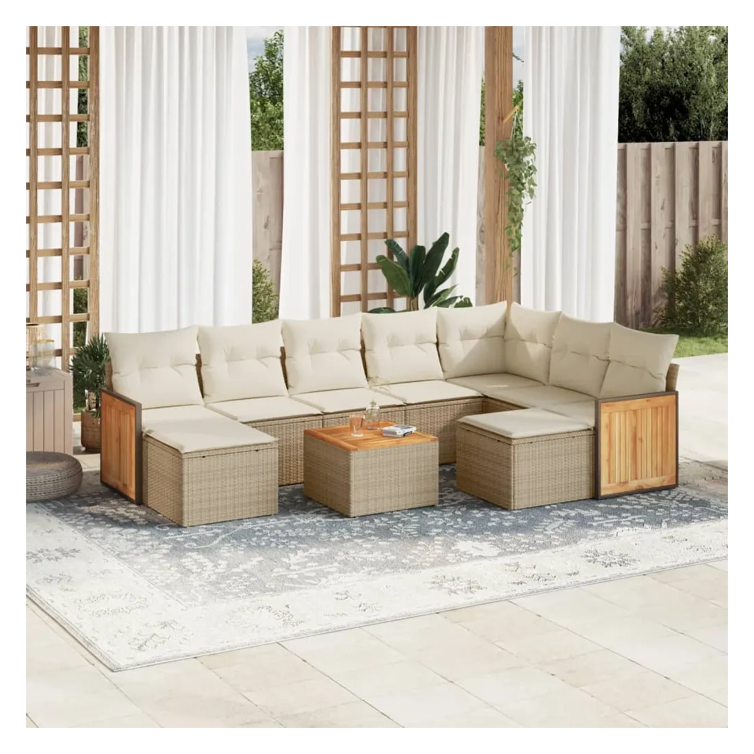 Cet ensemble de canapés de jardin est le complément parfait de votre arrière-cour, terrasse ou patio, offrant un espace confortable et accueillant pour discuter avec la famille et les amis ou simplement se détendre et profiter de l'extérieur. Matériau durable : la résine tressée, également connue sous le nom de poly rotin, est un matériau synthétique solide et nécessitant peu d'entretien qui ressemble au rotin naturel. Il est léger, facile à nettoyer et couramment utilisé pour les meubles d'extérieur en raison de sa durabilité et de ses propriétés de résistance aux intempéries.Fonction de rangement avec sac résistant à l'eau : le mobilier de jardin dispose d'un espace de rangement sous l'assise, complété par un sac résistant à l'eau pour ranger coussins, jouets et autres objets. Le sac intérieur peut être solidement fixé au mobilier d'extérieur grâce à des attaches auto-agrippantes pour plus de stabilité.Dessus stable et facile à nettoyer : cette table de jardin a un dessus en bois d'acacia robuste, durable et facile à nettoyer avec un chiffon humide.Housse amovible et lavable : ces coussins de siège sont dotés de housses amovibles pour un lavage et un entretien faciles.Conception modulaire : cet ensemble de meubles d'extérieur a une conception modulaire, ce qui le rend complètement flexible et facile à déplacer, afin que vous puissiez créer un agencement de meubles d'extérieur personnalisé. Bon à savoir :Pour que vos meubles d'extérieur restent beaux, nous vous recommandons de les protéger avec une housse imperméable.