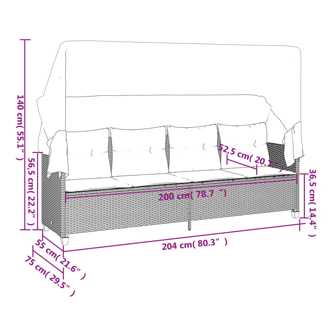 - Dimensions sans auvent : 204 x 55 x 69,5 cm (l x P x H)