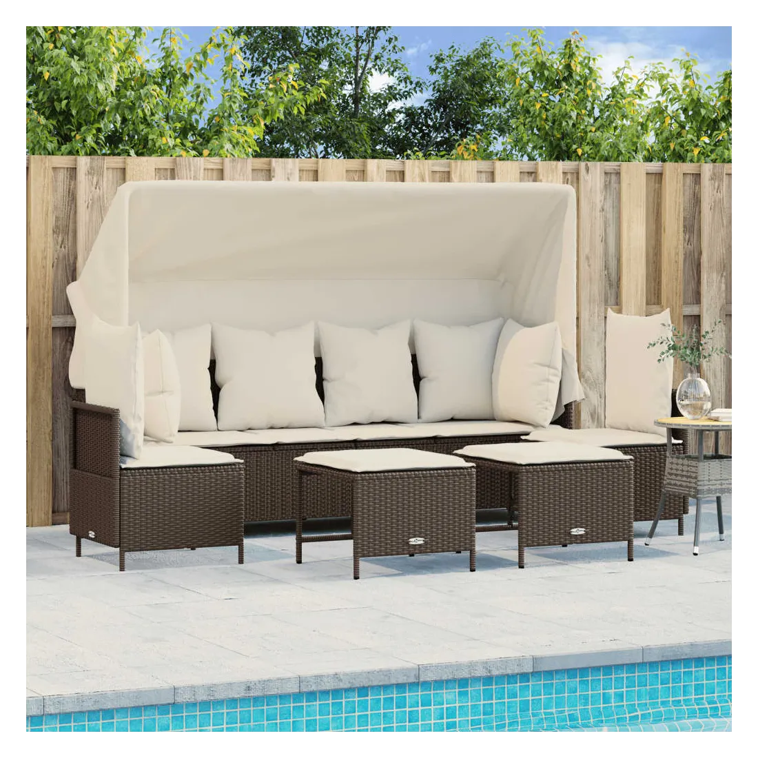Cet ensemble de canapés de jardin est le complément parfait de votre arrière-cour, terrasse ou patio, offrant un espace confortable et accueillant pour discuter avec la famille et les amis ou simplement se détendre et profiter de l'extérieur. Matériau durable : la résine tressée, également connue sous le nom de poly rotin, est un matériau synthétique solide et nécessitant peu d'entretien qui ressemble au rotin naturel. Il est léger, facile à nettoyer et couramment utilisé pour les meubles d'extérieur en raison de sa durabilité et de ses propriétés de résistance aux intempéries.Dossier et repose-pied réglables : ce meuble d'extérieur est doté d'un dossier à 3 positions réglables et d'un repose-pieds à 2 positions réglables, ce qui vous permet de trouver facilement la position la plus confortable et la plus appropriée pour la détente.Auvent rétractable : grâce à l'auvent rétractable, vous pouvez créer un environnement extérieur frais et agréable tout au long de la journée.Expérience d'assise confortable : ce mobilier d'extérieur, doté de coussins épais, offre une expérience d'assise confortable.Pouf polyvalent : le tabouret est polyvalent, servant de repose-pieds confortable lorsque vous vous prélassez sur le canapé ou de siège supplémentaire dans votre jardin. Bon à savoir :Pour que vos meubles d'extérieur restent beaux, nous vous recommandons de les protéger avec une housse imperméable.