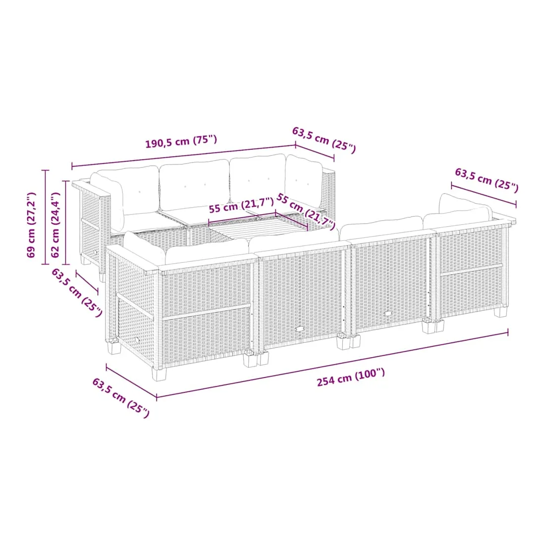 - Dimensions du coussin de dossier (angle) : 63,5 x 35 x 10 cm (L x l x é)