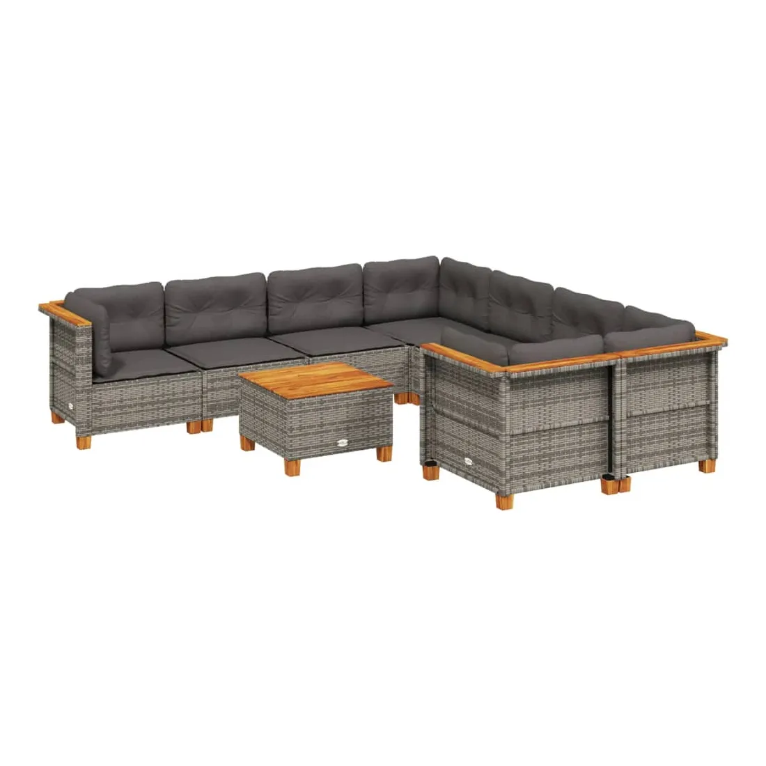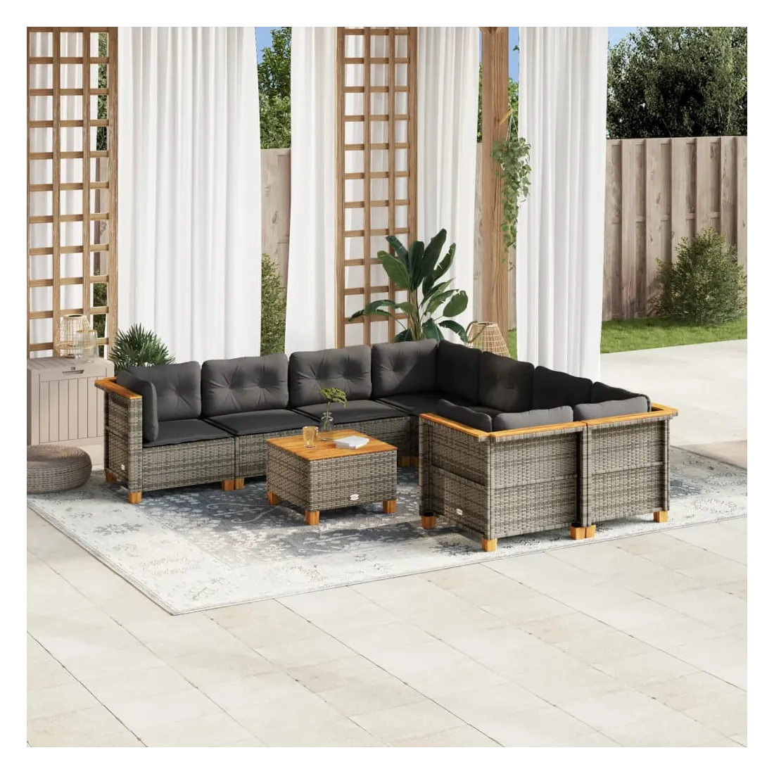 Cet ensemble de canapés de jardin est le complément parfait de votre arrière-cour, terrasse ou patio, offrant un espace confortable et accueillant pour discuter avec la famille et les amis ou simplement se détendre et profiter de l'extérieur. Matériau durable : la résine tressée, également connue sous le nom de poly rotin, est un matériau synthétique solide et nécessitant peu d'entretien qui ressemble au rotin naturel. Il est léger, facile à nettoyer et couramment utilisé pour les meubles d'extérieur en raison de sa durabilité et de ses propriétés de résistance aux intempéries.Expérience d'assise confortable : ce mobilier d'extérieur, doté de coussins épais, offre une expérience d'assise confortable.Housse amovible et lavable : ces coussins de siège sont dotés de housses amovibles pour un lavage et un entretien faciles.Dessus stable et facile à nettoyer : cette table de jardin a un dessus en bois d'acacia robuste, durable et facile à nettoyer avec un chiffon humide.Conception modulaire : cet ensemble de meubles d'extérieur a une conception modulaire, ce qui le rend complètement flexible et facile à déplacer, afin que vous puissiez créer un agencement de meubles d'extérieur personnalisé. Bon à savoir :Pour que vos meubles d'extérieur restent beaux, nous vous recommandons de les protéger avec une housse imperméable.