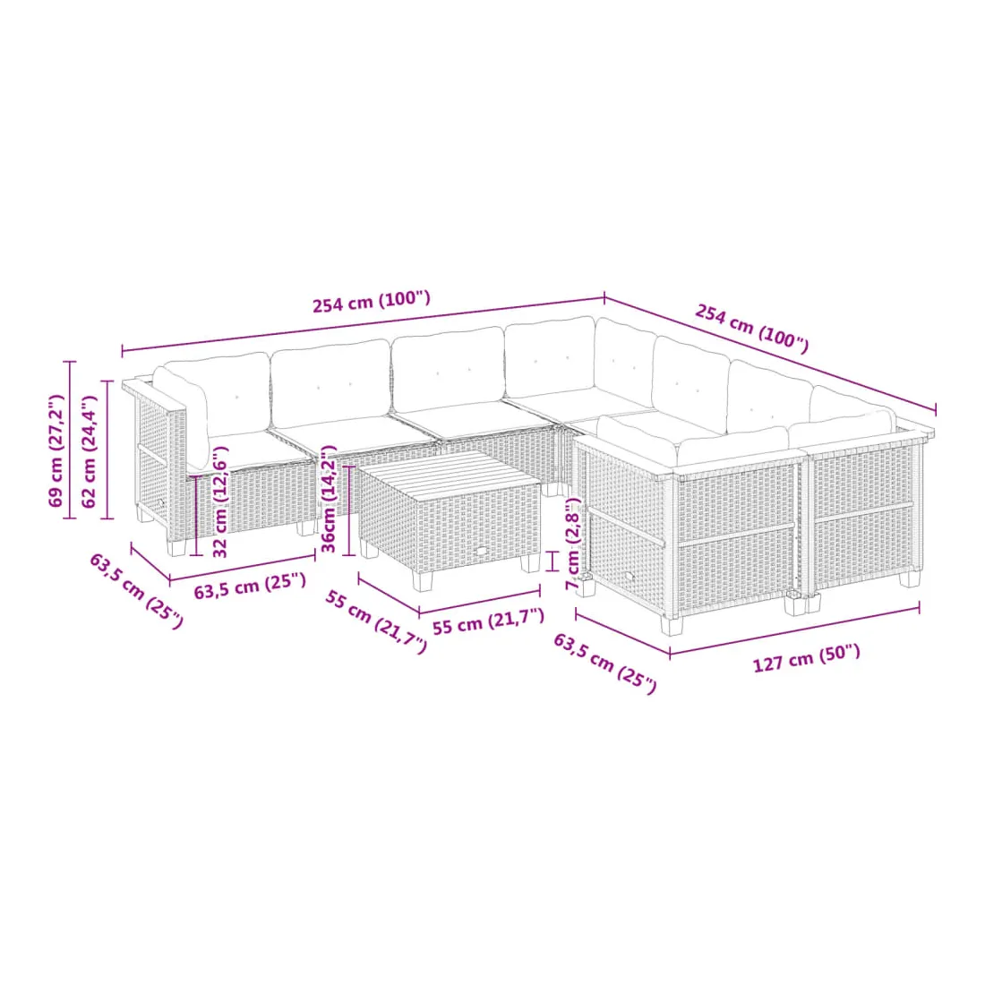 - Dimensions du coussin d’assise (angle) : 56,5 x 56,5 x 3 cm (l x P x é)