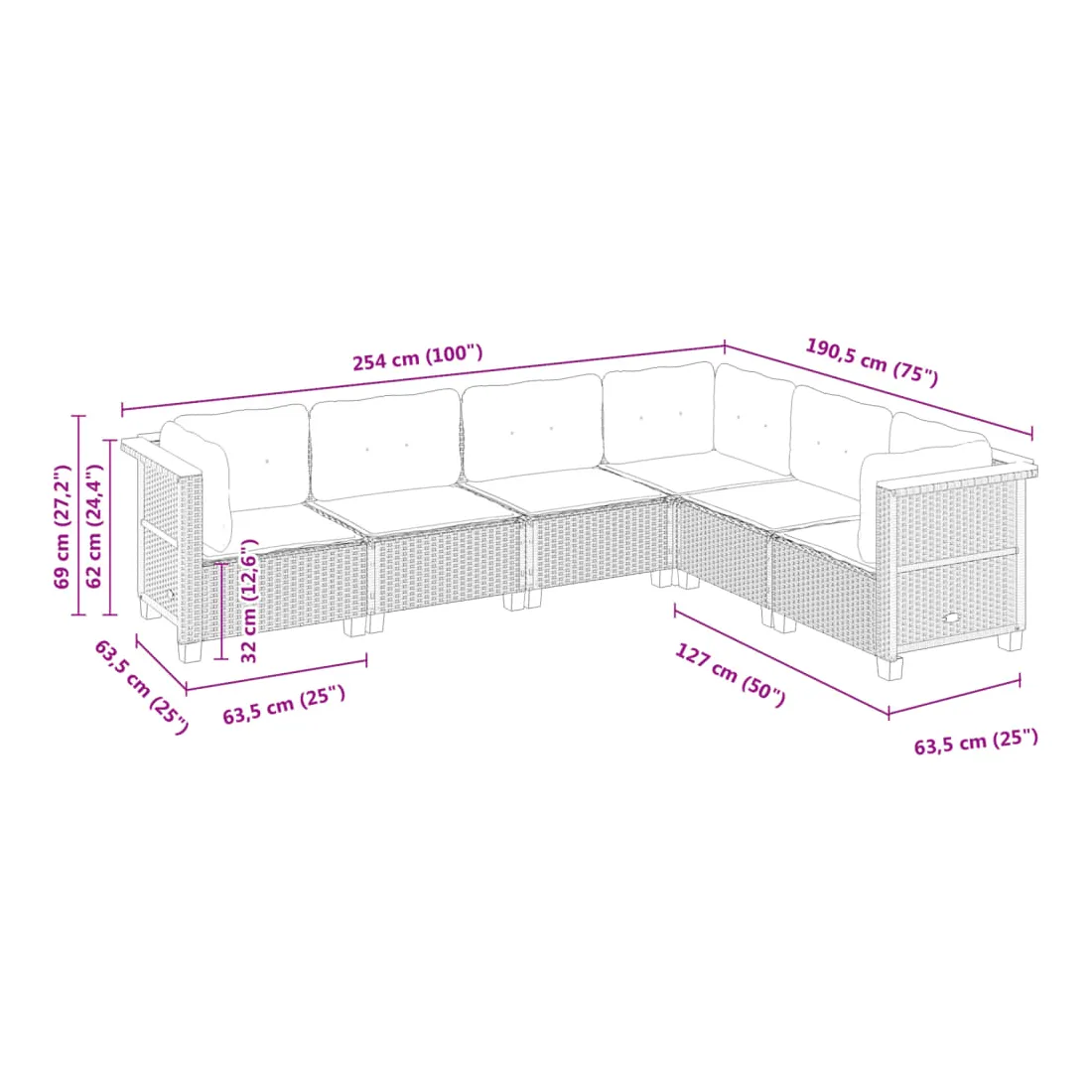 - Dimensions du coussin de dossier (angle) : 63,5 x 35 x 10 cm (L x l x é)