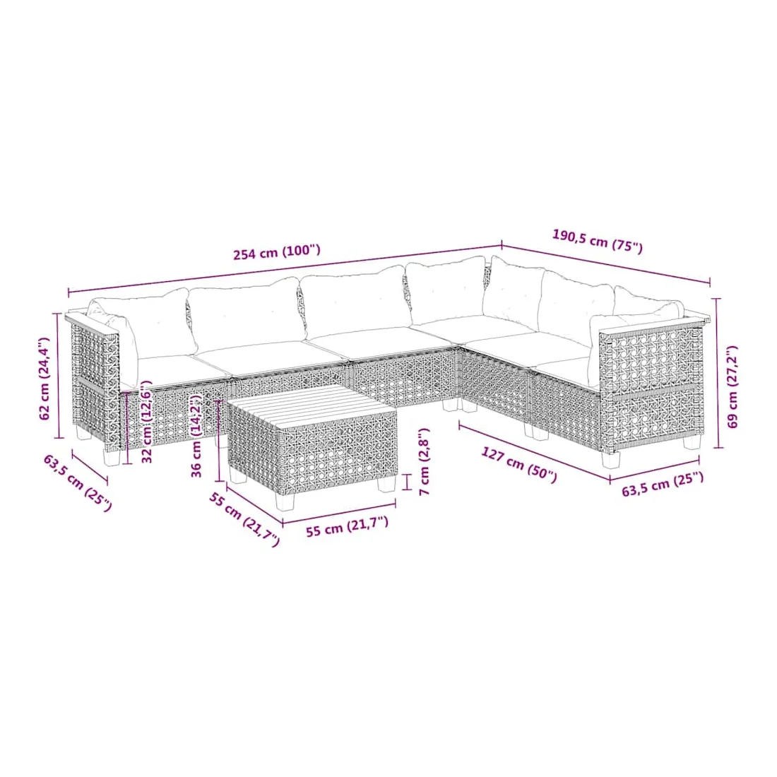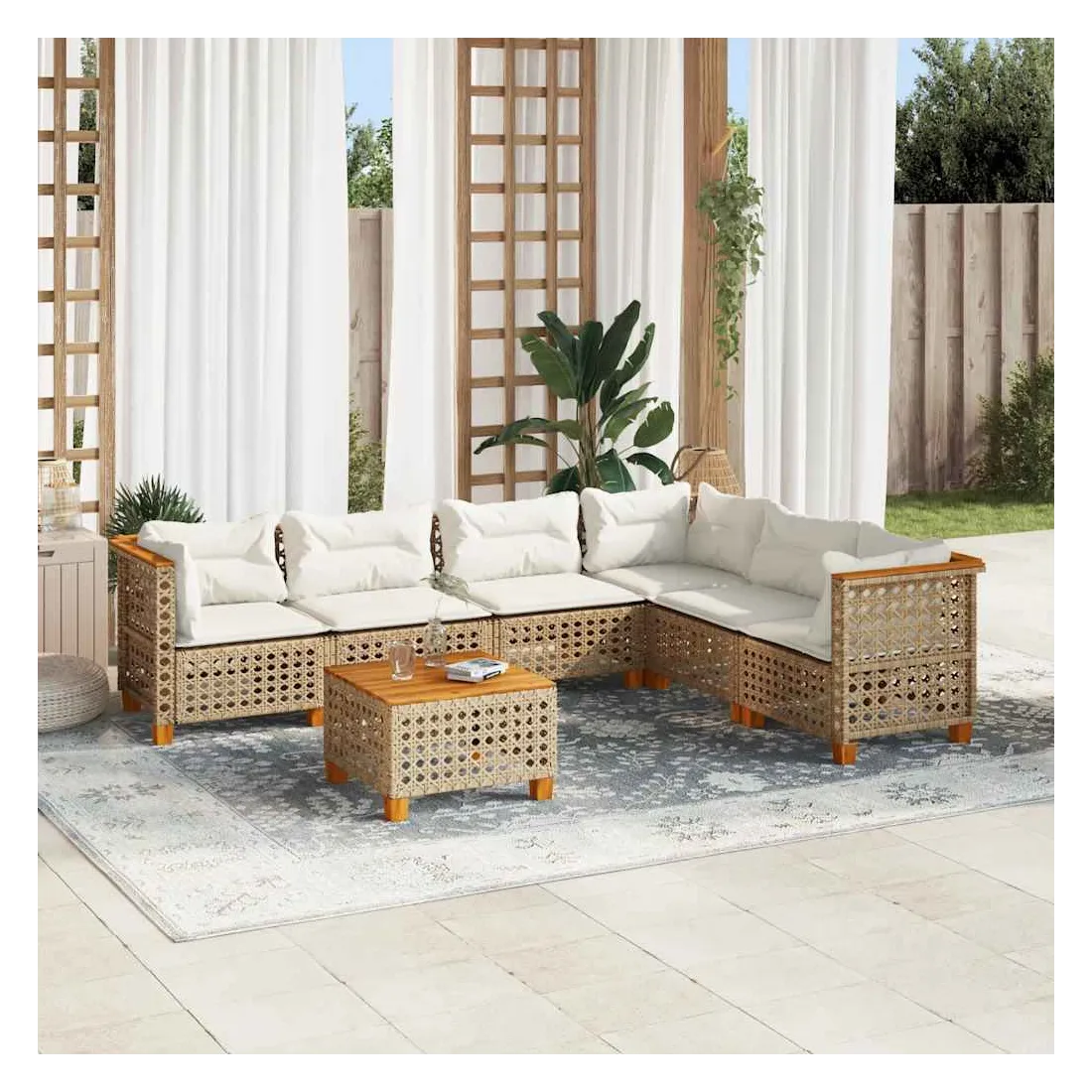 Cet ensemble de canapés de jardin est le complément parfait de votre arrière-cour, terrasse ou patio, offrant un espace confortable et accueillant pour discuter avec la famille et les amis ou simplement se détendre et profiter de l'extérieur. Matériau durable : la résine tressée, également connue sous le nom de poly rotin, est un matériau synthétique solide et nécessitant peu d'entretien qui ressemble au rotin naturel. Elle est légère, facile à nettoyer et couramment utilisée pour les meubles d'extérieur en raison de sa durabilité et de ses propriétés de résistance aux intempéries.Expérience d'assise confortable : ce mobilier d'extérieur, doté de coussins épais, offre une expérience d'assise confortable.Housse amovible et lavable : ces coussins de siège sont dotés de housses amovibles pour un lavage et un entretien faciles.Dessus stable et facile à nettoyer : cette table de jardin a un dessus en bois d'acacia robuste, durable et facile à nettoyer avec un chiffon humide.Conception modulaire : cet ensemble de meubles d'extérieur a une conception modulaire, ce qui le rend complètement flexible et facile à déplacer, afin que vous puissiez créer un agencement de meubles d'extérieur personnalisé. Bon à savoir :Pour que vos meubles d'extérieur restent beaux, nous vous recommandons de les protéger avec une housse imperméable.