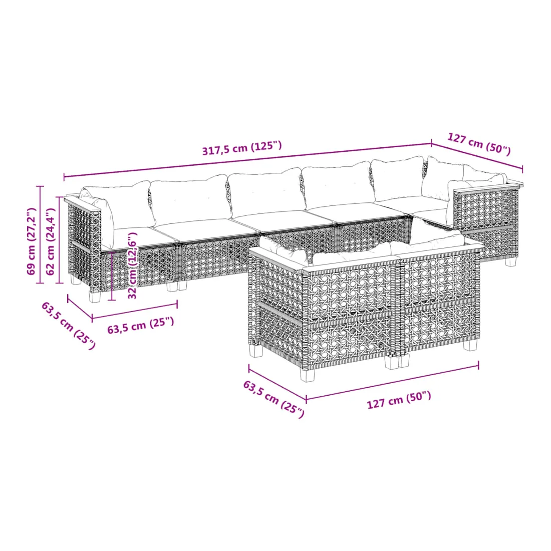- Dimensions du coussin de dossier (angle) : 63,5 x 35 x 10 cm (L x l x é)