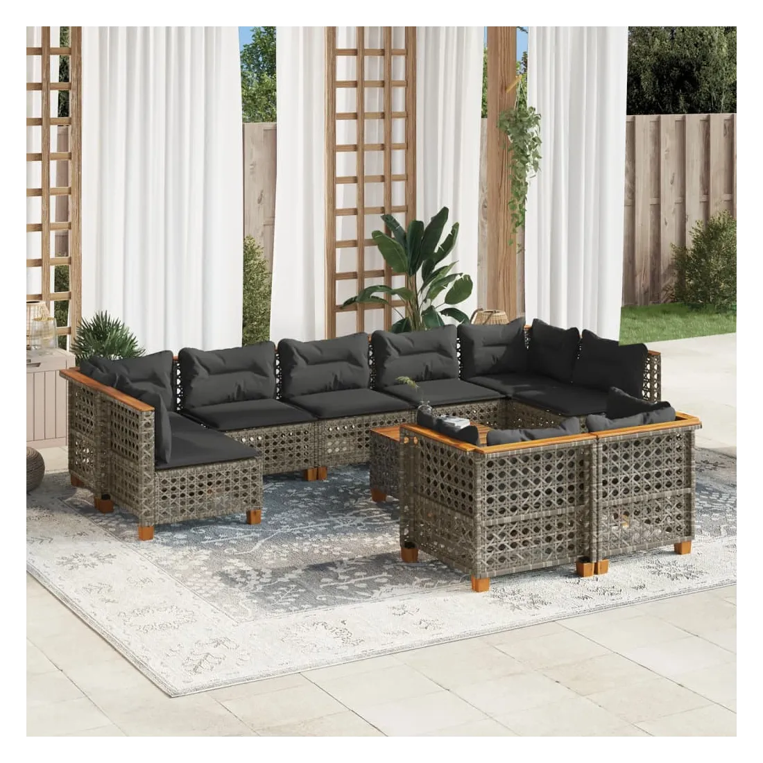Cet ensemble de canapés de jardin est le complément parfait de votre arrière-cour, terrasse ou patio, offrant un espace confortable et accueillant pour discuter avec la famille et les amis ou simplement se détendre et profiter de l'extérieur. Matériau durable : la résine tressée, également connue sous le nom de poly rotin, est un matériau synthétique solide et nécessitant peu d'entretien qui ressemble au rotin naturel. Il est léger, facile à nettoyer et couramment utilisé pour les meubles d'extérieur en raison de sa durabilité et de ses propriétés de résistance aux intempéries.Expérience d'assise confortable : ce mobilier d'extérieur, doté de coussins épais, offre une expérience d'assise confortable.Housse amovible et lavable : ces coussins de siège sont dotés de housses amovibles pour un lavage et un entretien faciles.Dessus stable et facile à nettoyer : cette table de jardin a un dessus en bois d'acacia robuste, durable et facile à nettoyer avec un chiffon humide.Conception modulaire : cet ensemble de meubles d'extérieur a une conception modulaire, ce qui le rend complètement flexible et facile à déplacer, afin que vous puissiez créer un agencement de meubles d'extérieur personnalisé. Bon à savoir :Pour que vos meubles d'extérieur restent beaux, nous vous recommandons de les protéger avec une housse imperméable.